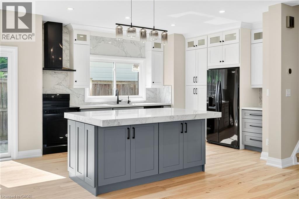 Kitchen with light stone counters, hanging light fixtures, black appliances, light wood-type flooring, and a kitchen island