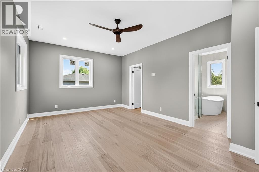 Unfurnished bedroom with a ceiling fan, multiple windows, light wood-style flooring, recessed lighting, and ensuite bath