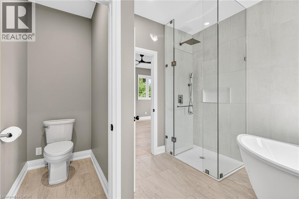 Bathroom featuring a stall shower, a freestanding bath, and a ceiling fan