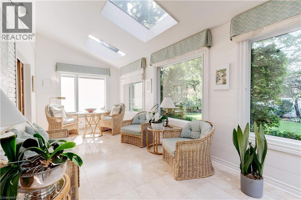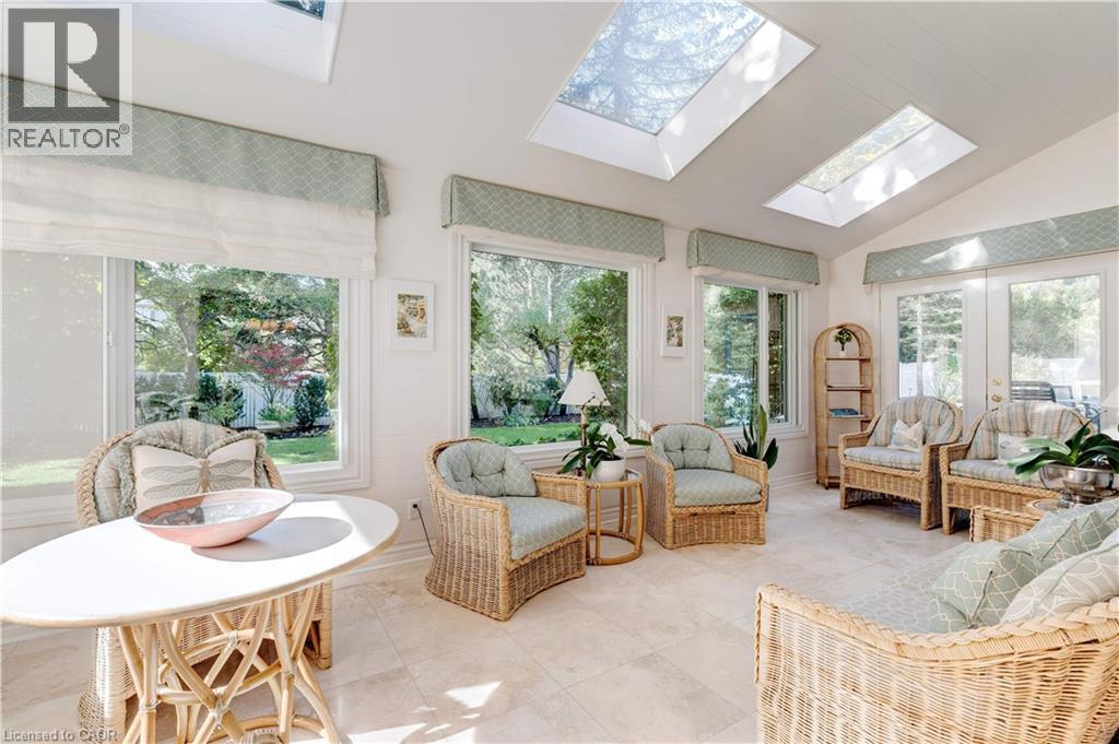 Sunroom / solarium featuring a skylight, vaulted ceiling, and tile patterned flooring