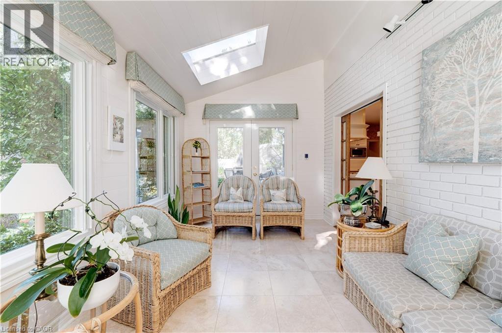 Sunroom / solarium featuring lofted ceiling, a skylight, tile patterned flooring, brick wall, and french doors