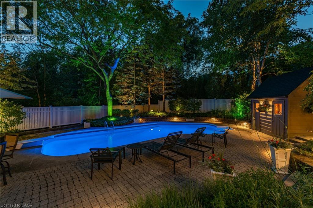 View of pool featuring an outbuilding, a patio, a fenced backyard, and a diving board