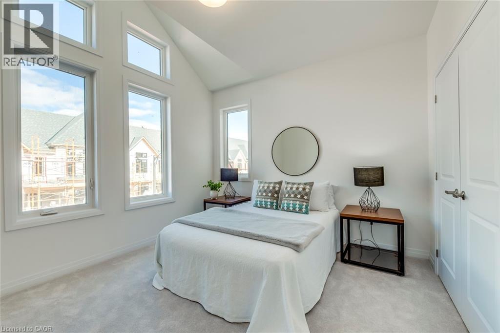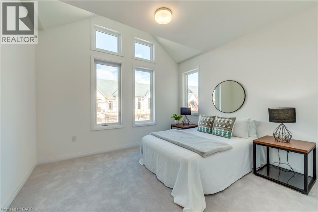 Bedroom with light colored carpet, lofted ceiling, and baseboards