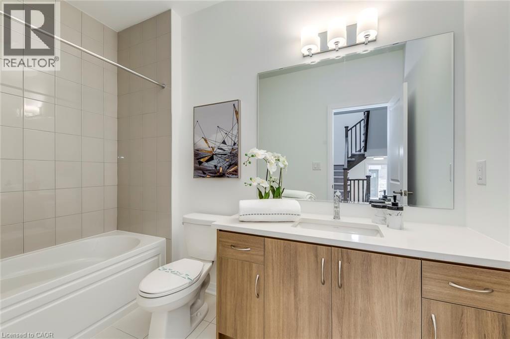 Full bathroom with vanity, tile patterned flooring, tub / shower combination, and toilet