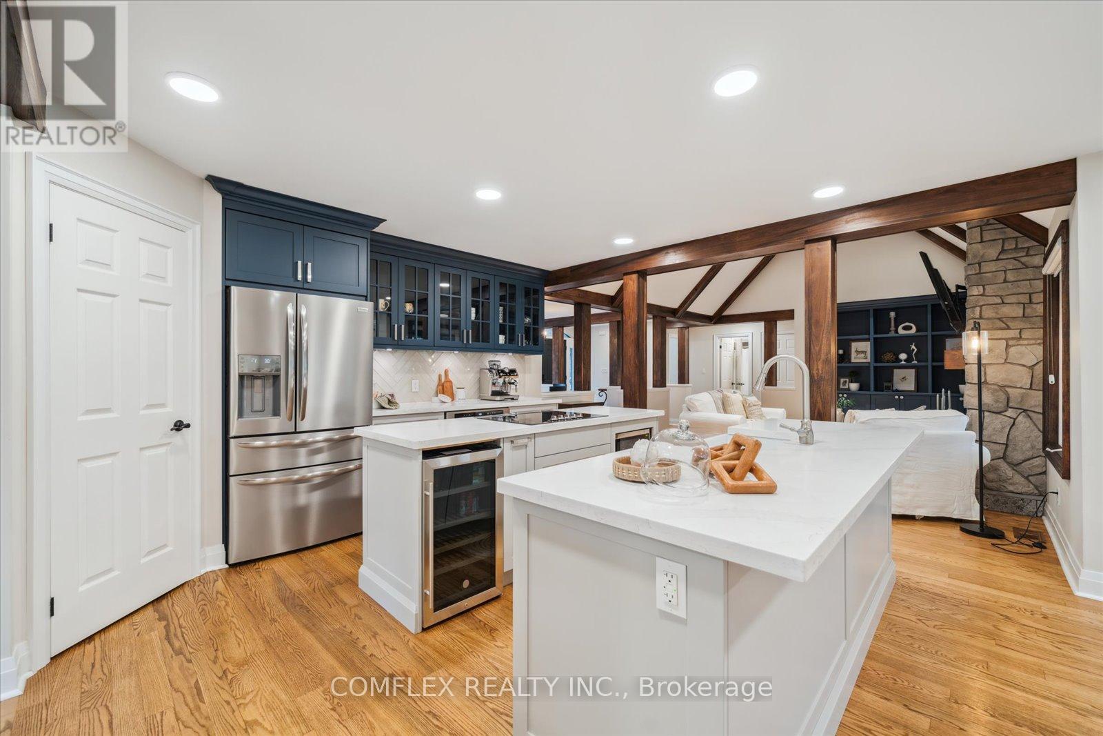 Gorgeous Custom Bungaloft on 1.16 Acres in Prestigious Bowmanville Neighbourhood. Welcome to this exceptional, custom-built bungaloft, located on a court and serviced by natural gas. From the moment you arrive, the attention to detail is unmistakable. The exterior showcases timeless craftsmanship with custom stonework, copper accents, marble sills, and soaring rooflines that combine to create stunning curb appeal. Step inside to discover a bright and airy open-concept layout that perfectly balances elegance with comfort. The main living space features solid hardwood floors, recessed lighting, and a great room with cathedral ceiling and nat gas fireplace. The freshly renovated gourmet kitchen is a true centerpiece, complete with full-height glass cabinetry, Corian countertops, walk-in pantry, and stainless steel appliances. A sunny breakfast area opens to a charming sunroom, ideal for your morning coffee or a quiet retreat. Main floor also includes a beautifully updated laundry/mudroom and well-appointed bedrooms, each offering private or shared access to ensuite bathrooms for optimal convenience. Upstairs, the spacious loft is a standout feature, offering endless flexibility. With vaulted 10-foot ceilings, a skylight, gleaming hardwood floors, natural gas fireplace, and its own 3-piece ensuite. This large space is perfect as a family room, home office, or private in-law suite! Property offers ample space for children to play, room to build a shop or pool, gardening, or simply enjoying the outdoors. The covered patio provides a perfect spot for year-round entertaining. Freshly finished basement adds custom glass office, Wet bar, Engineered hardwood flooring, huge bedroom, and fitness space. Located just minutes from Bowmanville's vibrant urban center, two golf courses, and the Bowmanville Valley Conservation Area, this home offers the ideal balance of serenity and accessibility. Quick access to Highways 401 and 407/418. Roof 2018, Furnaces 2016, A/C 2019. (id:63285)