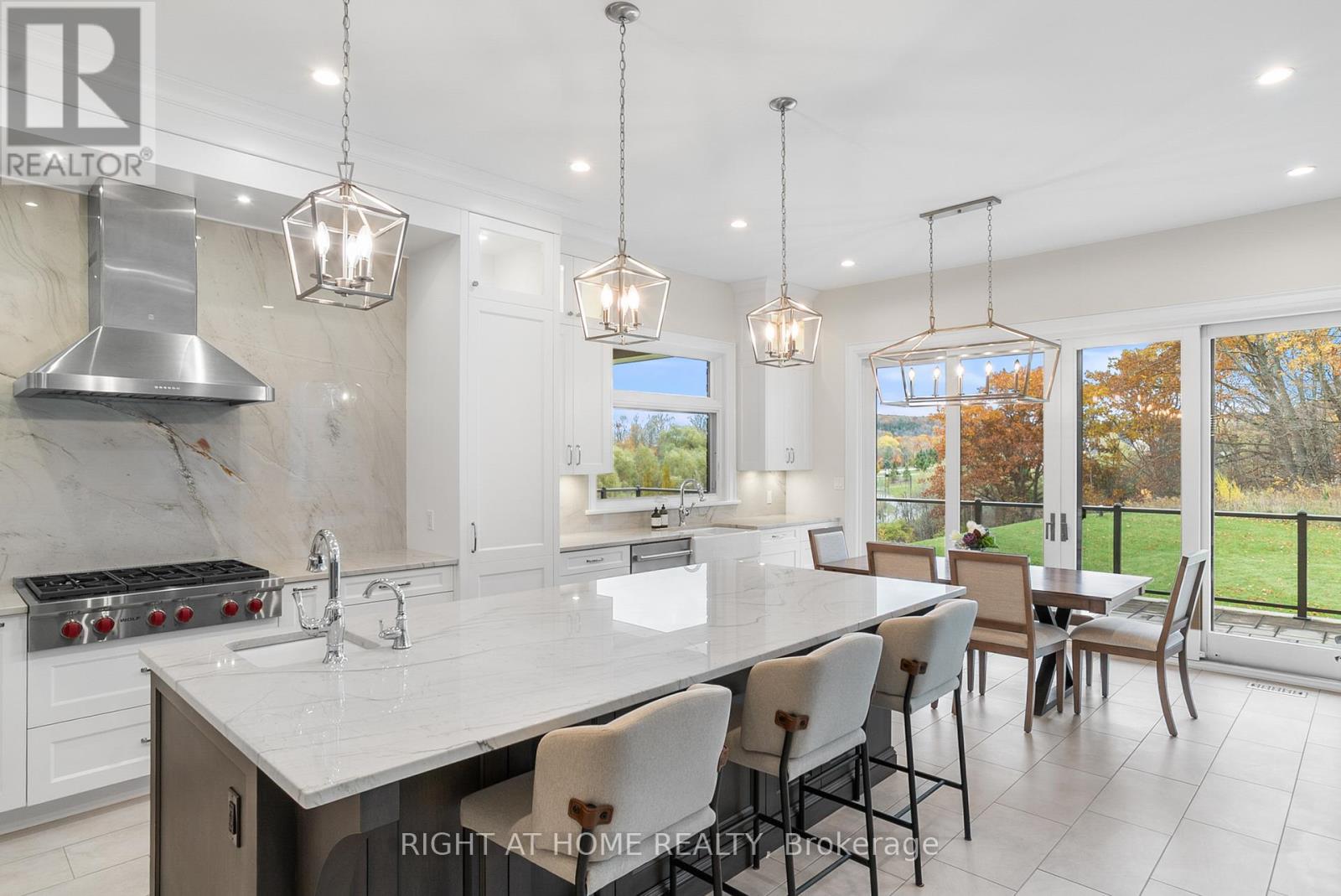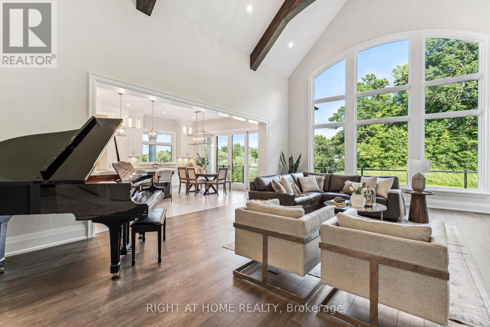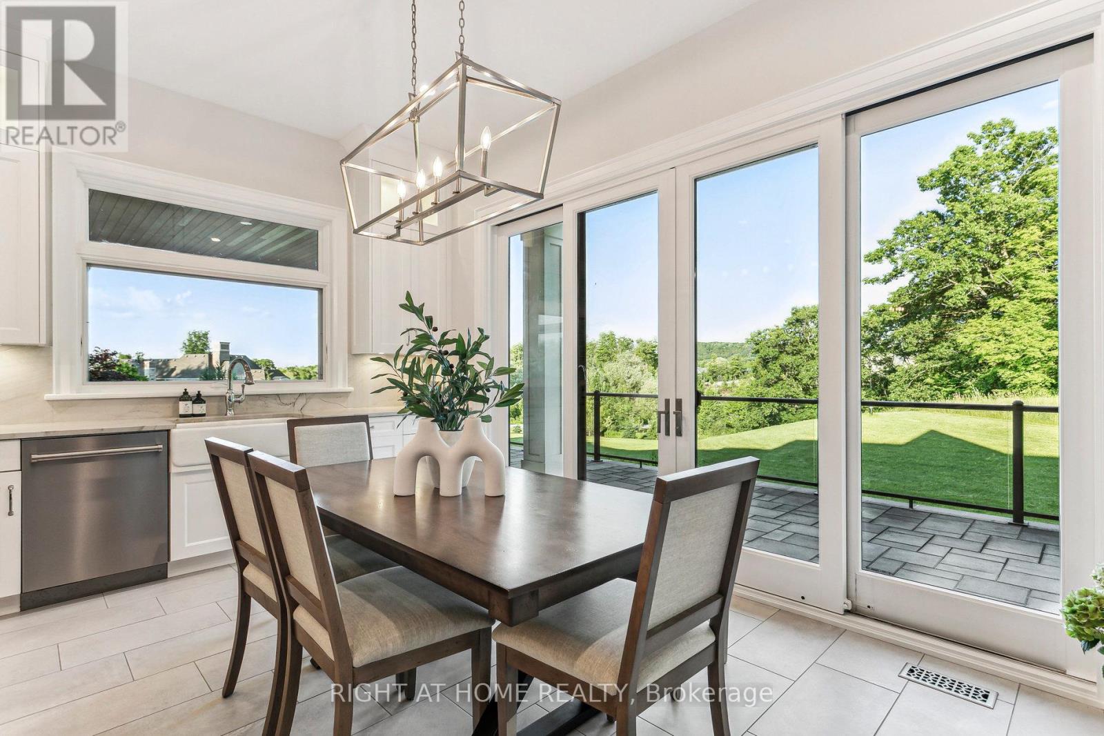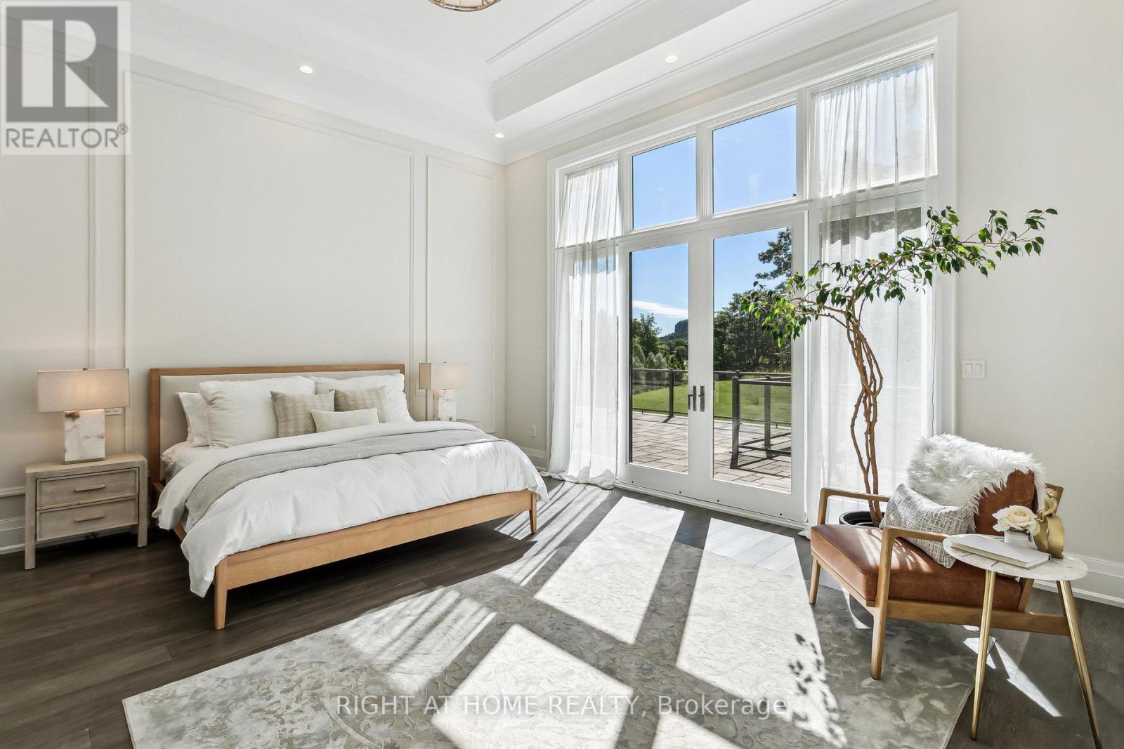 Set against the breathtaking backdrop of Mt. Nemo, this custom-built estate showcases the ultimate balance of luxury, privacy, and natural beauty. Perfectly situated at the end of a quiet cul-de-sac, this home offers exceptional privacy on over 2 private acres. This 6,400 sq.ft home, built in 2019, features 5 spacious bedrooms & 5 elegant bathrooms. A bright 3,400sqft walk-out lower level expands the home's footprint, offering incredible potential for customized living or entertaining space! A grand centre-hall entrance opens to a cathedral-height great room w/ 22ft ceilings, a porcelain-slab fireplace wall, wood beams, and floor-to-ceiling windows that fill the space with natural light. The main kitchen is a chef's dream, complete w/ a large island, granite counters, and high-end appliances, complemented by a secondary kitchen with a 6-burner Wolf gas range and walk-in pantry- ideal for entertaining. The formal dining room connects through a butler's servery with pocket doors, while hardwood floors flow throughout and radiant-heated flooring warms all tiled areas. A 3-car garage offers interior access to both levels. Smart-home lighting, climate control, and an 8-camera security system extend throughout the home for ultimate comfort and safety. The main-level primary suite, with soaring 14ft ceilings, opens to the rear porch and treeline views & includes 2 walk-in closets w/ a built-in vanity & a luxurious 5-pc ensuite. 2 staircases then lead to spacious bedrooms and a loft with glass railing overlooking the great room & forest views. A convenient storage room is also flexibly roughed in for an additional bathroom. Outdoors, venue-style entertaining is effortless with a covered porch and uninterrupted treetop views.Steps from Lowville Golf Course and major highways 407,QEW & 403 just mins away, this property blends peaceful country living with city convenience for a perfect mix of luxury, privacy, and accessibility in one of Burlington's most prestigious enclaves. (id:63285)