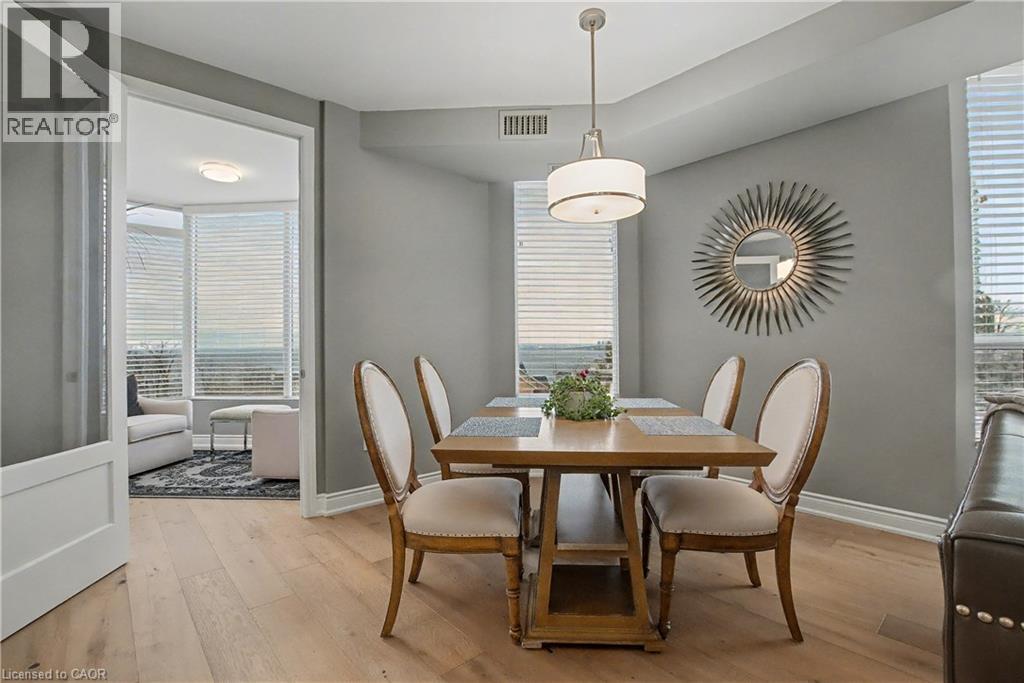 Location, Location! Within steps of Burlington’s vibrant downtown, 2121 Lakeshore Road — “Village Gate” — stands as an exclusive boutique condominium. Welcome to Unit 603, a distinguished corner suite where luxury, light and views define every room. Featuring 9' ceilings, expansive windows, and beautifully scaled principal rooms, this residence blends contemporary elegance with soft, refined décor. Every detail has been thoughtfully curated to offer a serene, elevated living experience. The open-concept Living & Dining Room is ideal for both lavish entertaining & intimate evenings at home. A separate Den provides a tranquil space to unwind while taking in the view. The custom Kitchen showcases white cabinetry, quartz surfaces, a breakfast bar, glass tile backsplash, LED pot lights, & stainless steel appliances. Tucked away from the main living area, the Bedroom Wing offers discretion & calm. A charming Hall Library welcomes you into the private quarters. The Principal Bedroom Retreat impresses with a cozy sitting area framed by a bay window, custom walk-in closet, a spa-inspired 3-piece Ensuite featuring heated tile floors, vanity w/quartz counters, step-in shower & linen closet. A spacious Second Bedroom, also highlighted by its own bay window & stunning views, ensures guests enjoy comfort & style. The Main Bath mirrors the luxe finishes of the ensuite w/heated flooring, white cabinetry, quartz counters & a step-in shower. Additional Appointments: In-suite Laundry w/ stacked washer/dryer & storage. Engineered hardwood floors; custom blinds; tall interior doors; closets w/custom organizers, two linen closets. Two Parking Spaces. Locker. The building offers FOB-secured lobby access, elevators & visitor parking. Unmatched Downtown lifestyle: cafés, boutiques, Performing Arts Centre, fine dining, Art Gallery, Waterfront Trail, plus nearby hospital, transit, recreation, shopping & major highways. Unit 603 at 2121 Lakeshore Road — “Honey, I’m Home.” (id:63285)