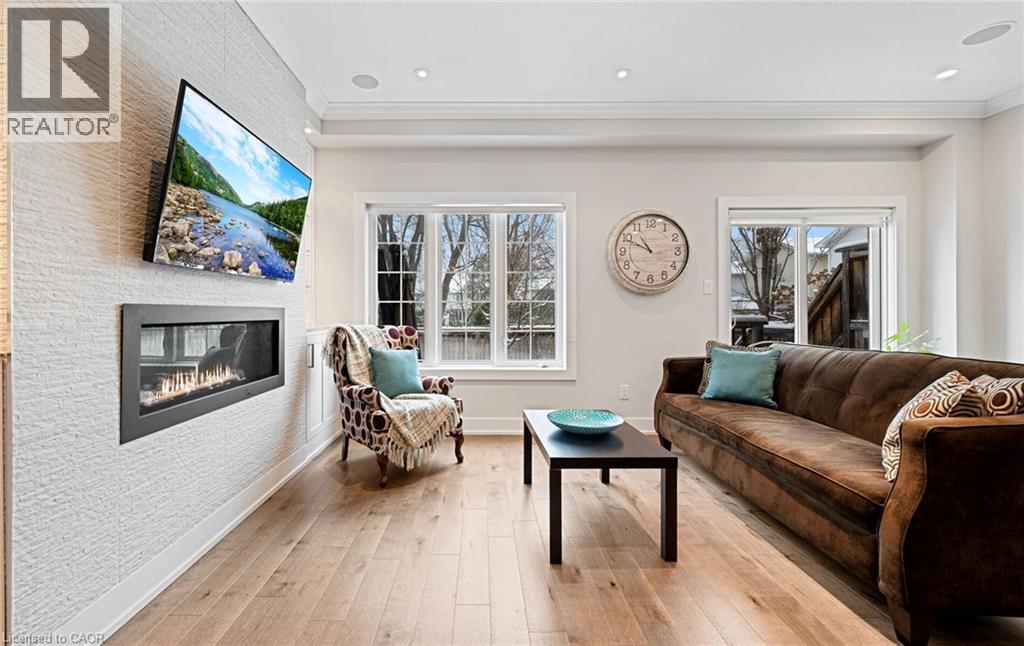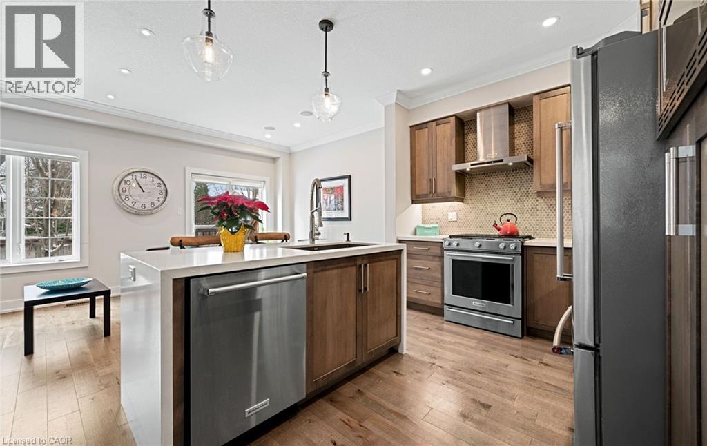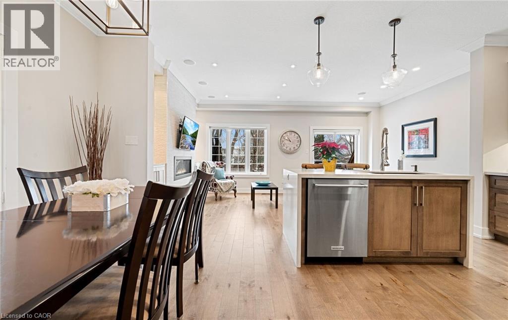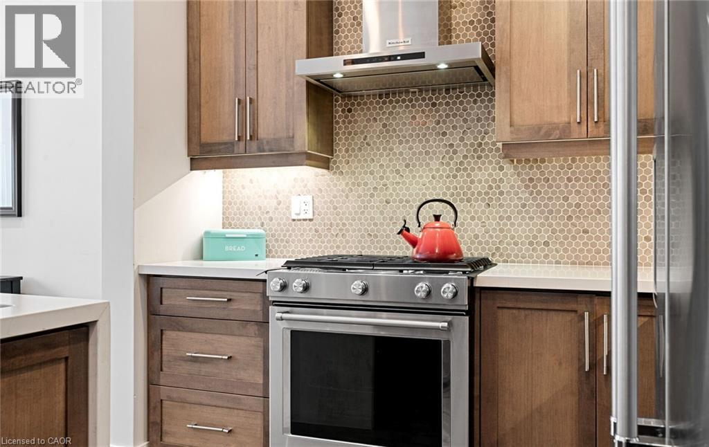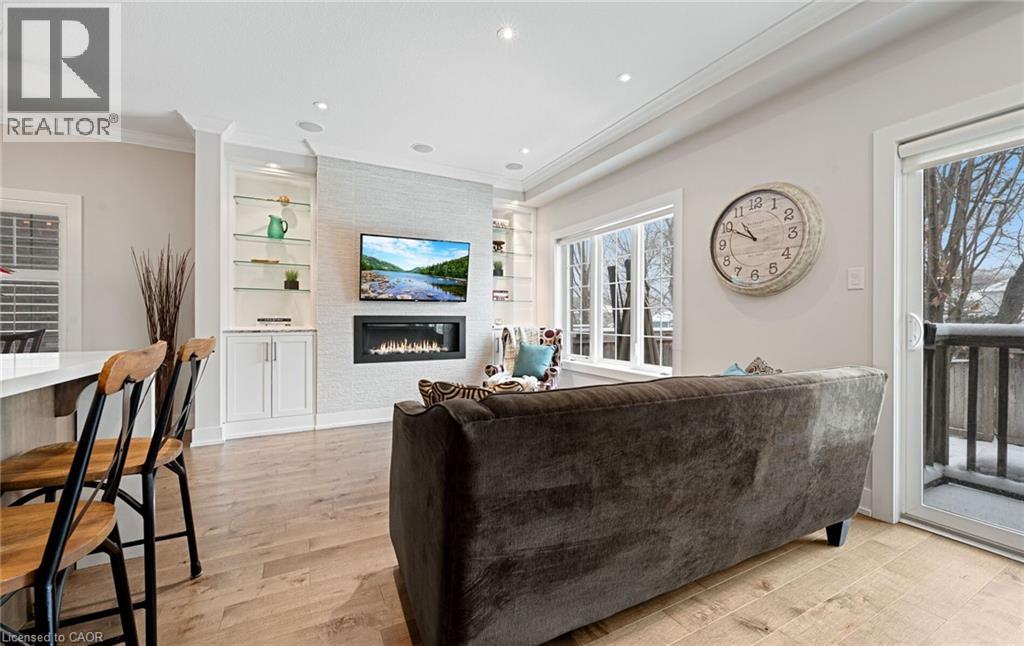 Welcome to refined executive living just moments from Downtown Burlington and the vibrant Brant Street corridor. This rare end-unit condo townhouse offers approx. 2,000 sq. ft. of beautifully finished space (1,473 sq. ft. above grade + 527 sq. ft. below), blending upscale design with unmatched urban convenience near the lakefront, boutique shops, dining, Spencer Smith Park, GO Transit, and major highways. The bright, open-concept main level features 9-ft ceilings, rich flooring, designer lighting, and expansive windows that maximize natural light—an advantage of the premium end-unit location. The chef-inspired KitchenAid kitchen impresses with custom cabinetry, a waterfall quartz island, and a 5-burner gas range, all flowing into the elegant dining and living areas. A striking stone gas fireplace with custom built-ins, a convenient 2-piece powder room, and whole-home audio with integrated home theatre elevate the space for everyday comfort and high-end entertaining. Upstairs, three generous bedrooms include a serene primary retreat with walk-in closet and spa-like ensuite. A stylish 4-piece main bath and second-floor laundry add to the thoughtful executive design. The fully finished lower level extends the lifestyle with a refined recreation room featuring wood-look flooring, LED pot lights, frosted glass doors, and a spa-inspired 3-piece bath with heated floors—ideal for a media room, office, gym, or guest suite. Smart home upgrades include Lutron lighting and Google Nest controls, providing modern comfort and efficiency. Set within a top-rated school district and close to parks, trails, and Burlington’s signature waterfront, this home delivers the perfect blend of luxury, location, and lifestyle—ideal for professionals, downsizers, and families seeking executive living near Burlington’s most coveted amenities. (id:63285)