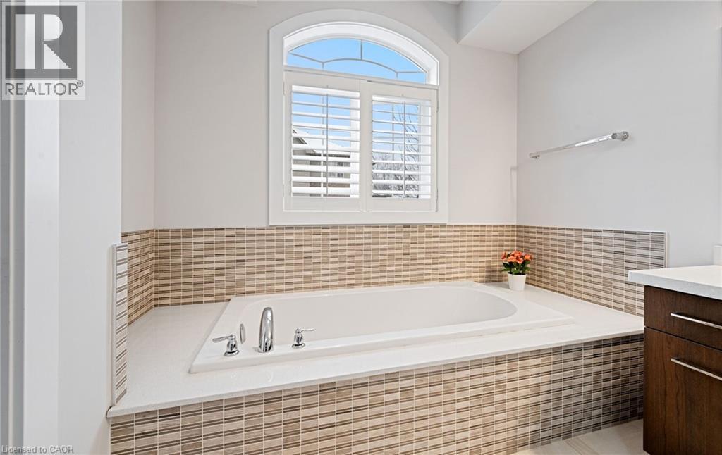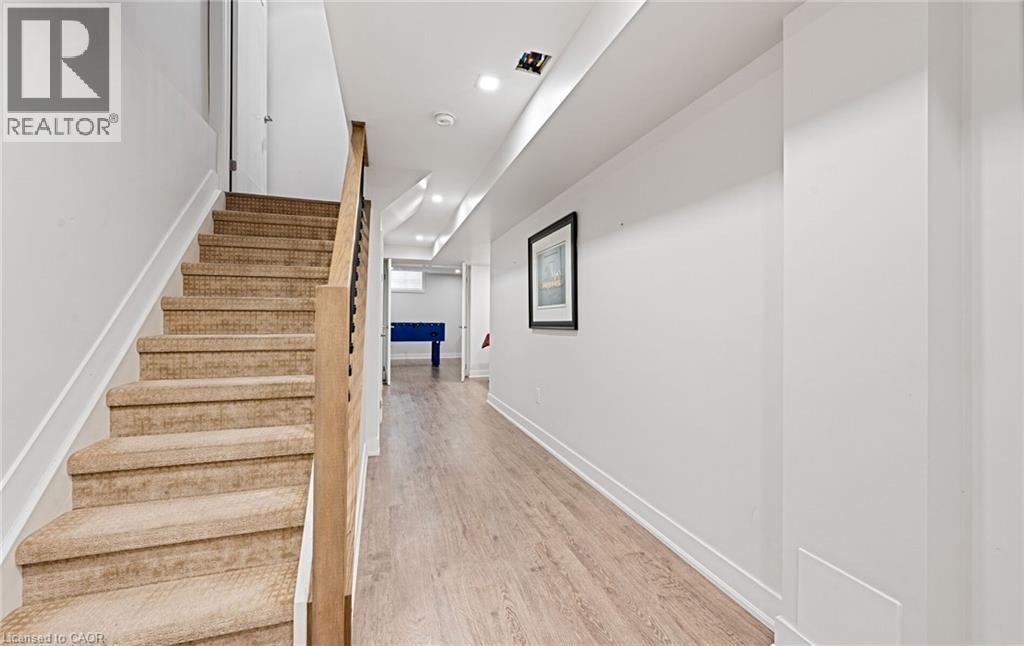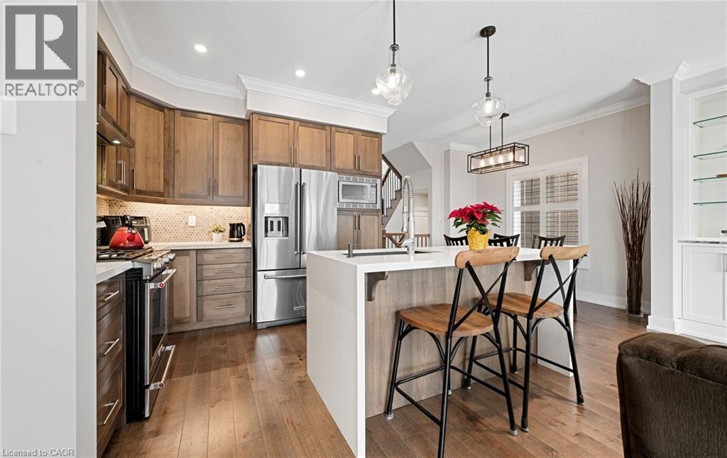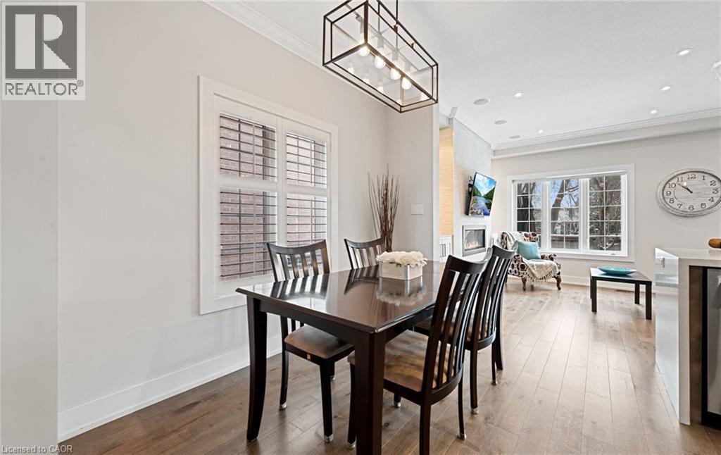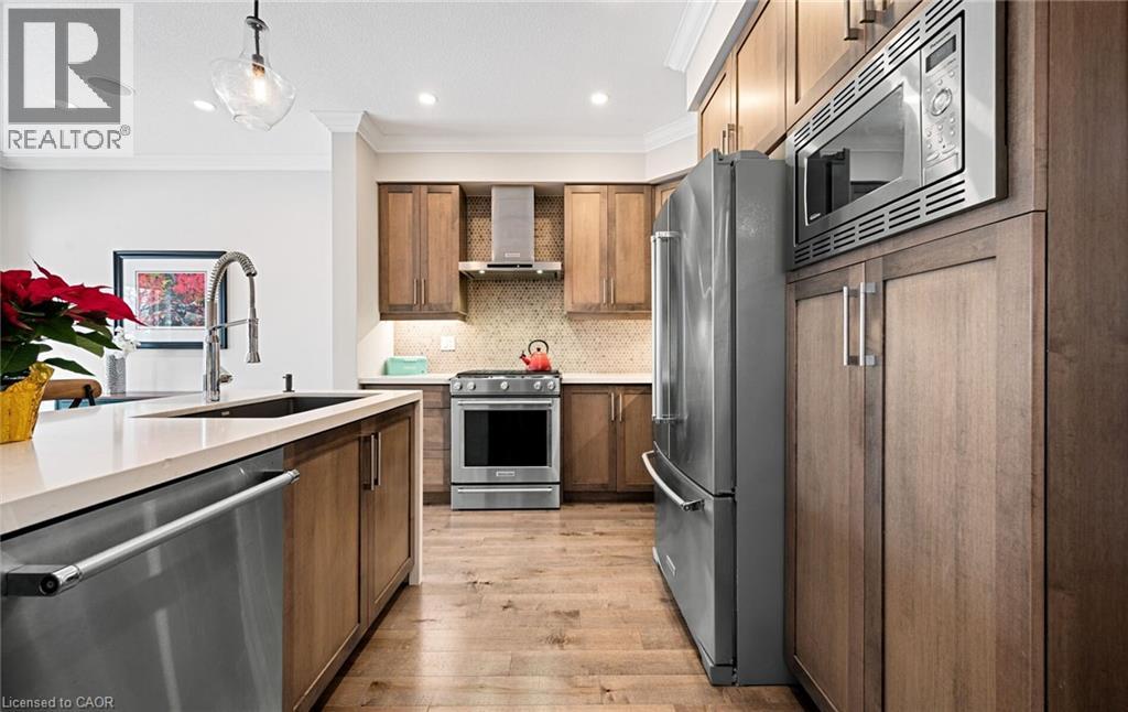 Welcome to refined executive living just moments from Downtown Burlington and the vibrant Brant Street corridor. This rare end-unit condo townhouse offers approx. 2,000 sq. ft. of beautifully finished space (1,473 sq. ft. above grade + 527 sq. ft. below), blending upscale design with unmatched urban convenience near the lakefront, boutique shops, dining, Spencer Smith Park, GO Transit, and major highways. The bright, open-concept main level features 9-ft ceilings, rich flooring, designer lighting, and expansive windows that maximize natural light—an advantage of the premium end-unit location. The chef-inspired KitchenAid kitchen impresses with custom cabinetry, a waterfall quartz island, and a 5-burner gas range, all flowing into the elegant dining and living areas. A striking stone gas fireplace with custom built-ins, a convenient 2-piece powder room, and whole-home audio with integrated home theatre elevate the space for everyday comfort and high-end entertaining. Upstairs, three generous bedrooms include a serene primary retreat with walk-in closet and spa-like ensuite. A stylish 4-piece main bath and second-floor laundry add to the thoughtful executive design. The fully finished lower level extends the lifestyle with a refined recreation room featuring wood-look flooring, LED pot lights, frosted glass doors, and a spa-inspired 3-piece bath with heated floors—ideal for a media room, office, gym, or guest suite. Smart home upgrades include Lutron lighting and Google Nest controls, providing modern comfort and efficiency. Set within a top-rated school district and close to parks, trails, and Burlington’s signature waterfront, this home delivers the perfect blend of luxury, location, and lifestyle—ideal for professionals, downsizers, and families seeking executive living near Burlington’s most coveted amenities. (id:63285)