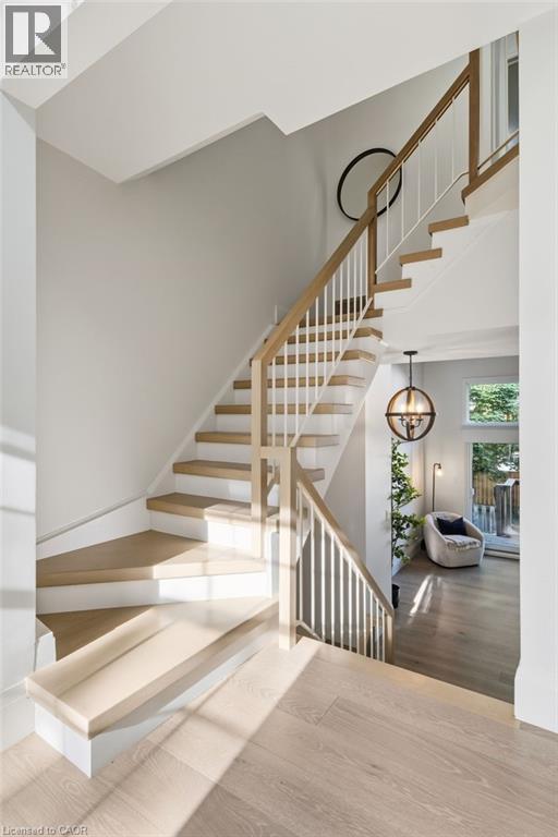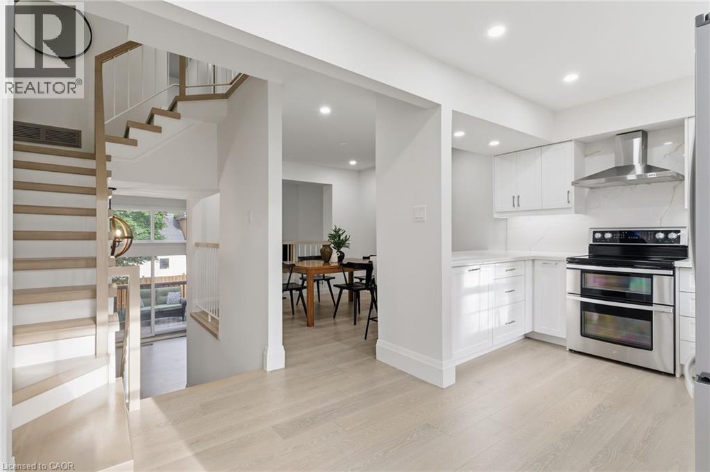 A wonderful opportunity in the Downtown Burlington core! This 3 bedroom townhome was fully updated in 2024. Custom touches including new cabinetry & built-ins, stairs, railings, and hardwood floors top to bottom. The bright new kitchen has ample storage, quartz countertops, and new stainless steel appliances. The high ceiling living space with natural light has an oversized sliding door to the private back deck & tree lined green space for a tranquil retreat in the city. The generously sized designer-grade 4 piece bathroom has a luxurious feel consistent with the lifestyle this location offers. 2 exclusive use parking spaces, inside access from the garage, visitor parking, and the year round property upkeep offers a low maintenance lifestyle for families, retirees, and investors alike. Steps to all of the restaurants, shopping, amenities, and waterfront festivals that Downtown Burlington has to offer. Great Schools, parks, public transit, and major highway access all within minutes. (id:63285)