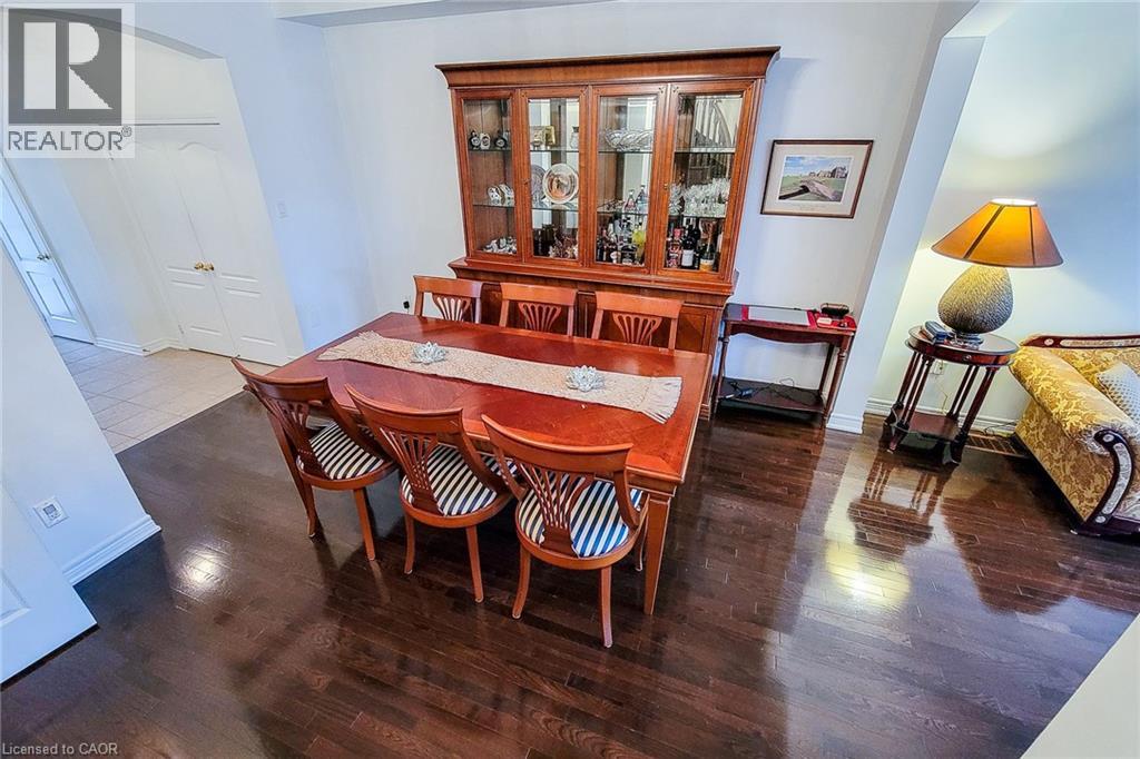 Dining area featuring arched walkways and dark wood finished floors