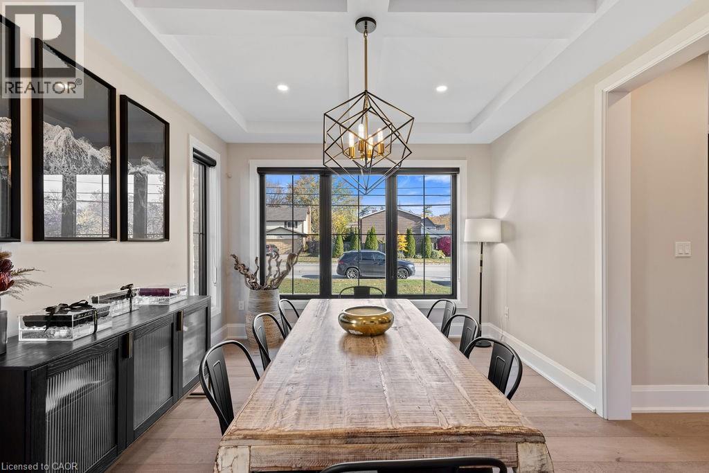 Dining room with light wood-style flooring, recessed lighting, coffered ceiling, baseboards, and a chandelier