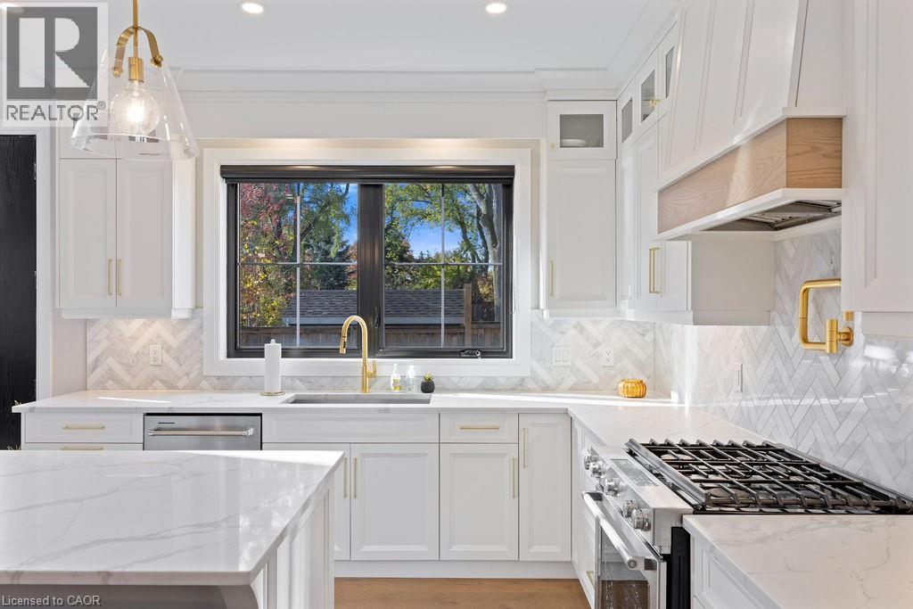 Kitchen featuring a sink, light stone counters, white cabinets, custom range hood, and appliances with stainless steel finishes
