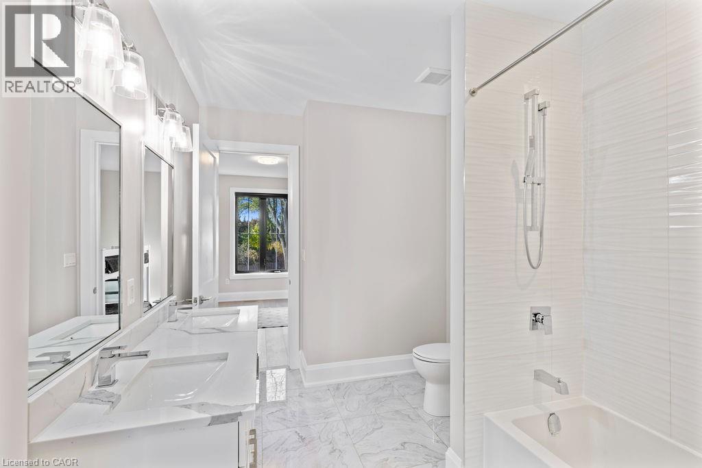Full bathroom with double vanity, marble finish floor, baseboards, and a sink