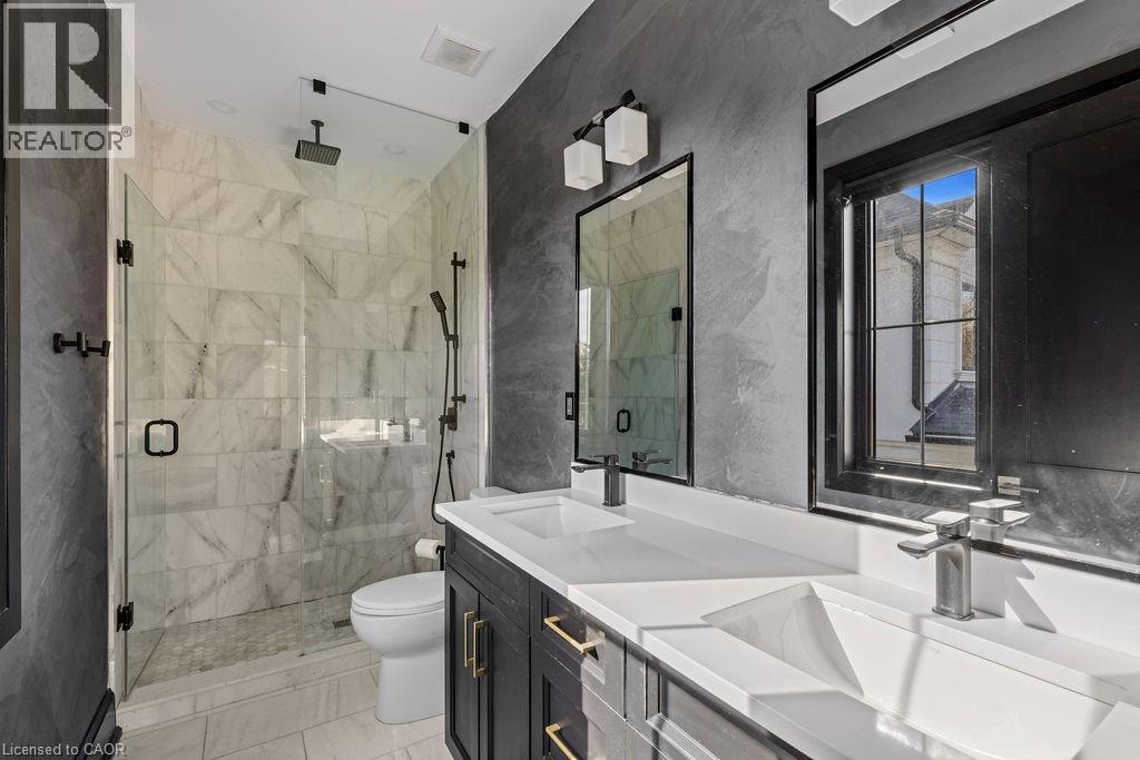Full bathroom featuring toilet, marble finish floor, a shower stall, and a sink