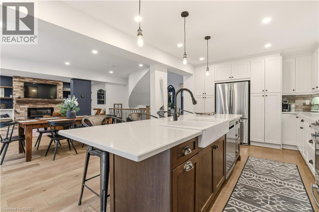 Kitchen with a kitchen breakfast bar, light wood-style flooring, decorative light fixtures, light stone counters, and stainless steel appliances