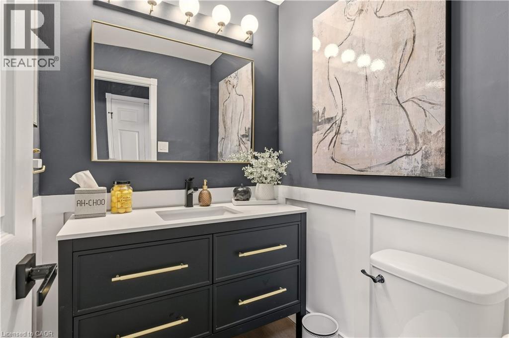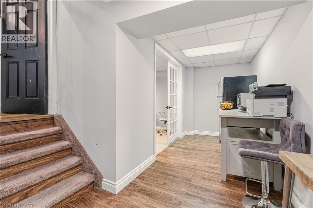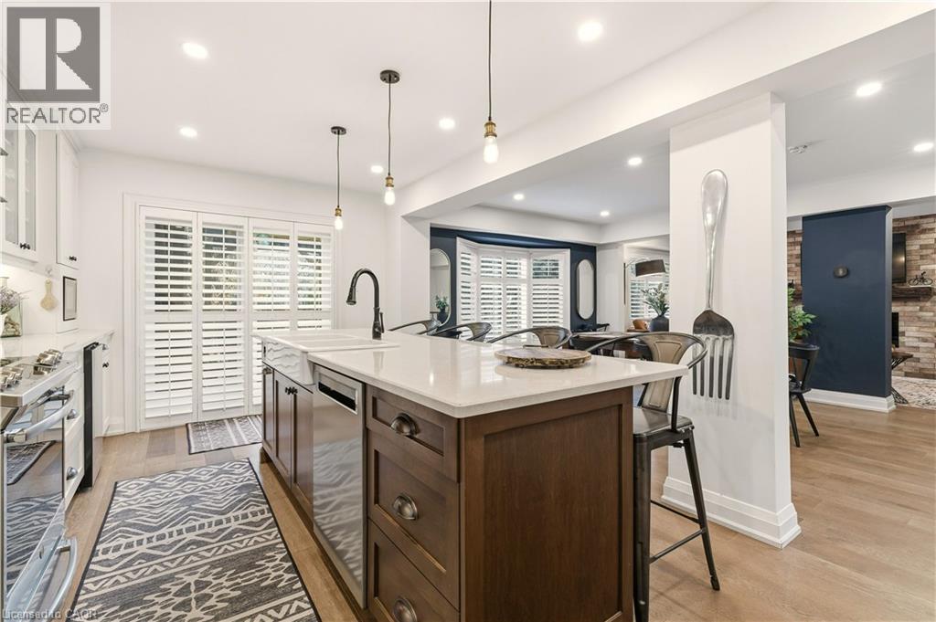 Kitchen with hanging light fixtures, white cabinetry, light wood-style floors, and recessed lighting