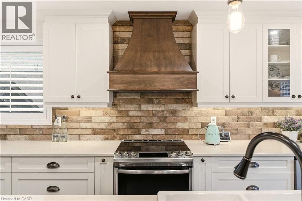 Kitchen with white cabinets, electric range, custom range hood, and glass insert cabinets