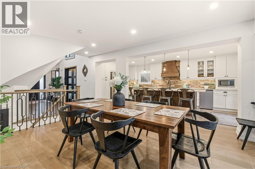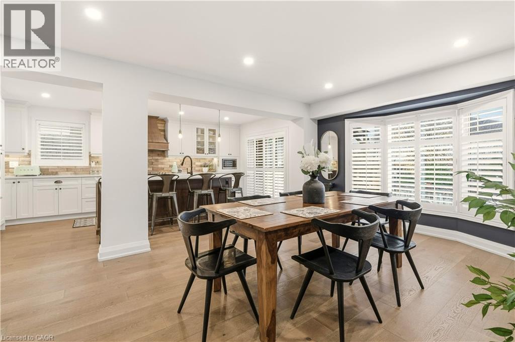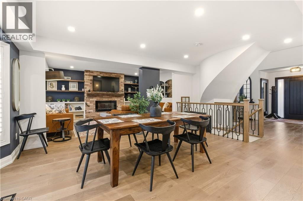 Dining area featuring light wood-style flooring, a brick fireplace, and recessed lighting