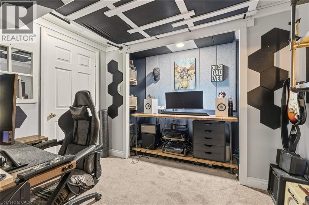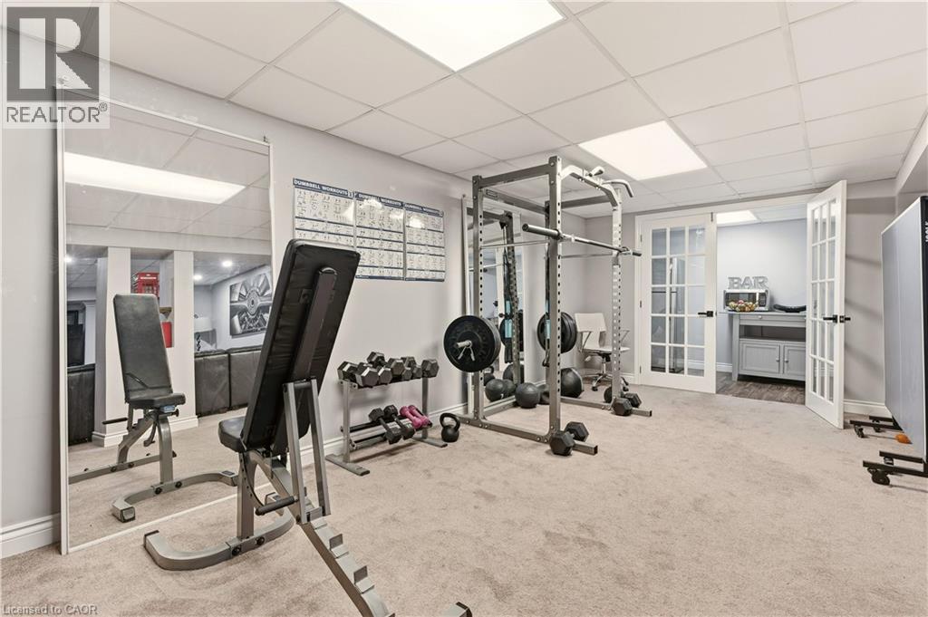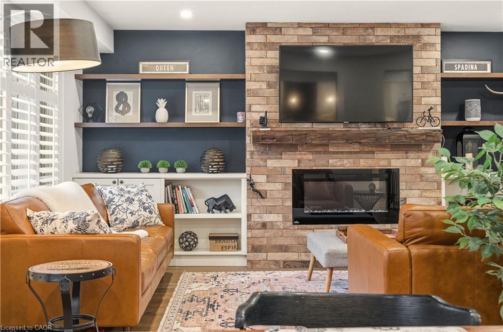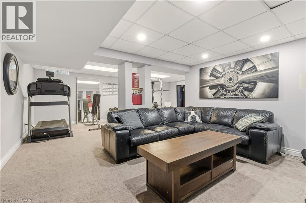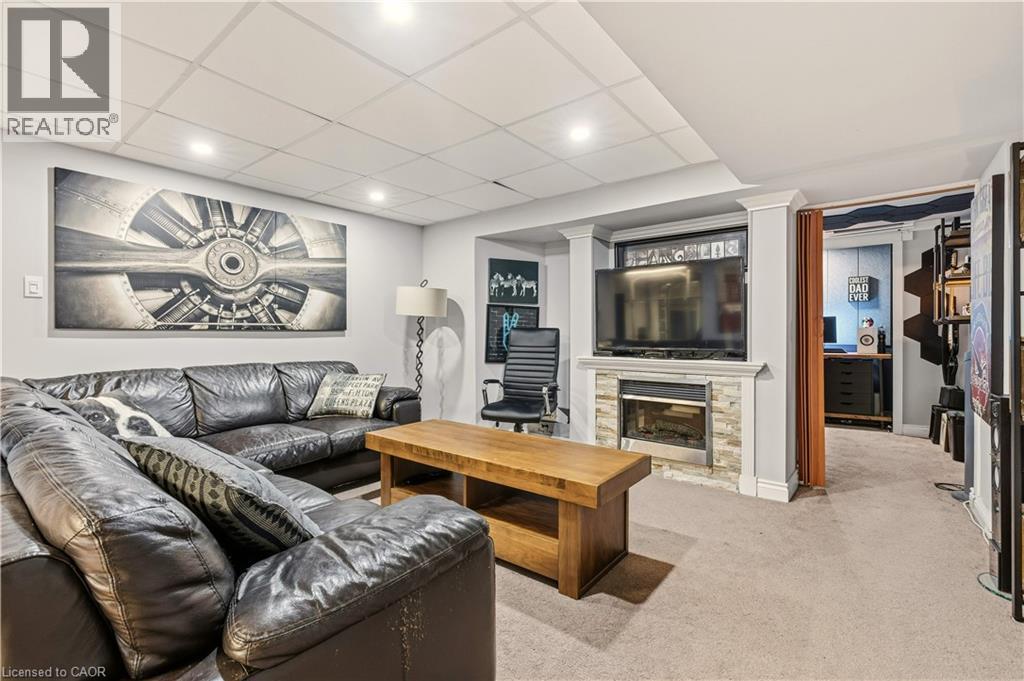Living room featuring light carpet, a fireplace, and a paneled ceiling