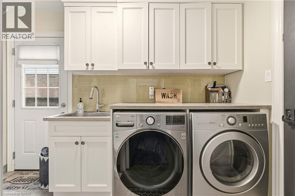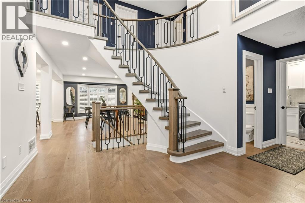 Stairs featuring hardwood / wood-style floors, a high ceiling, recessed lighting, and washer / clothes dryer