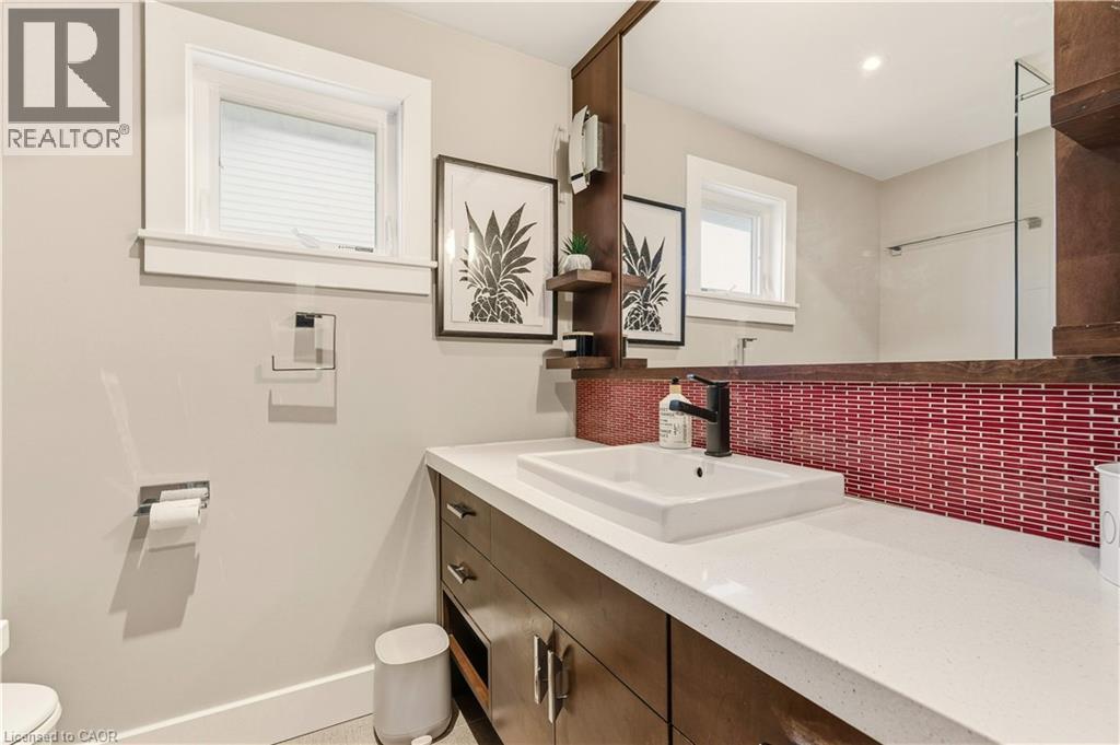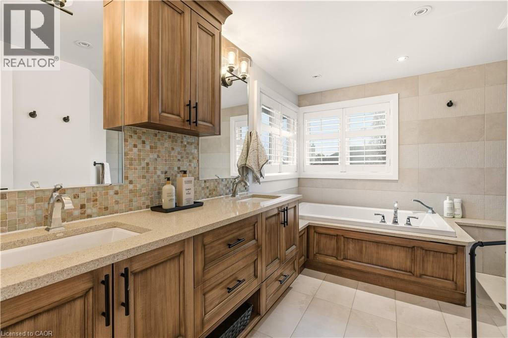 Bathroom with decorative backsplash, double vanity, a bath, light tile patterned flooring, and recessed lighting
