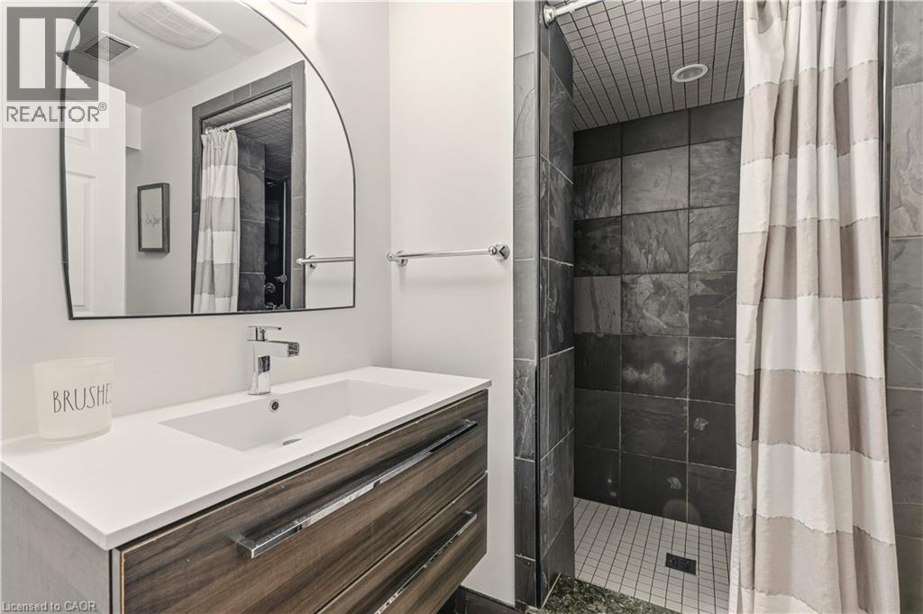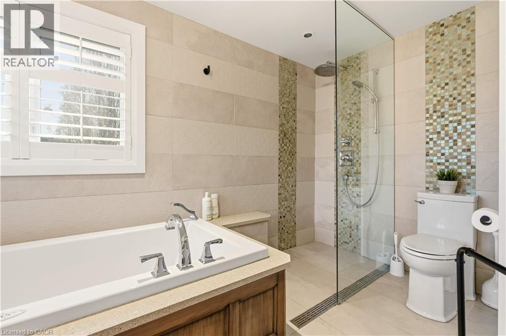 Bathroom with tile walls, a garden tub, walk in shower, and vanity