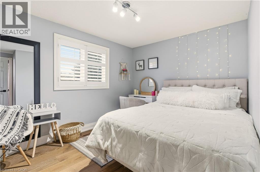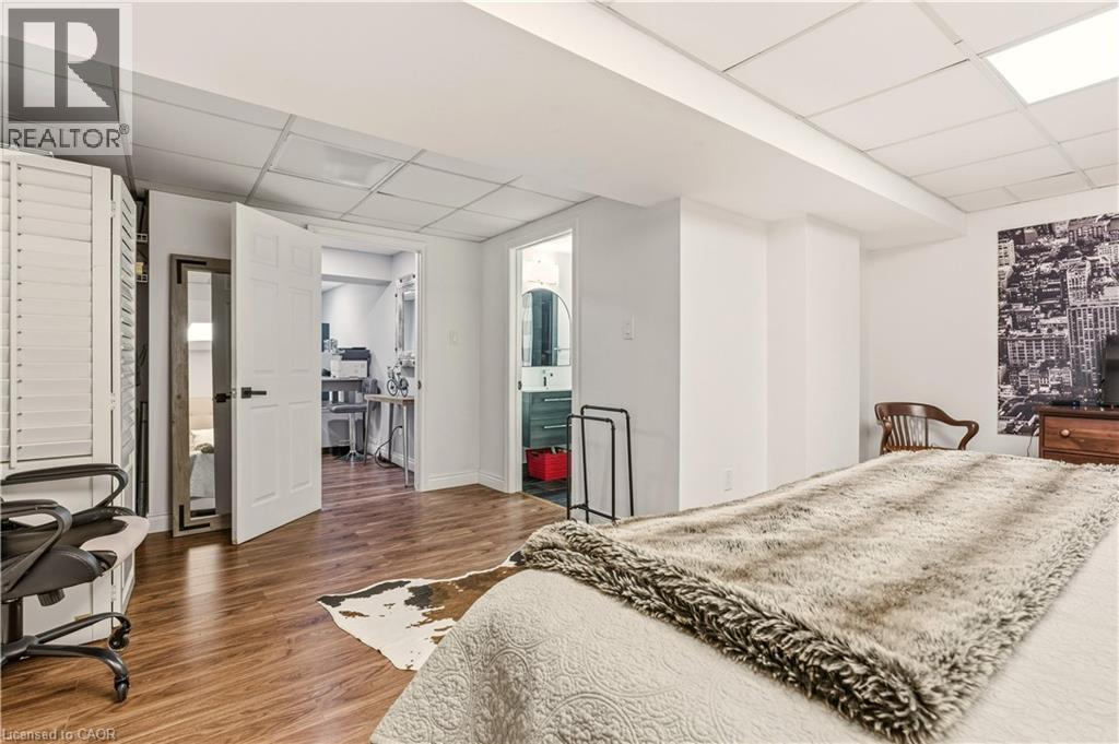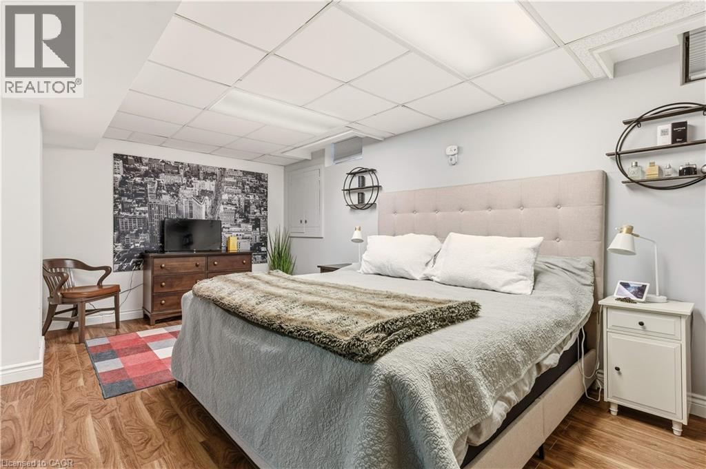Bedroom with a drop ceiling, wood finished floors, and a closet