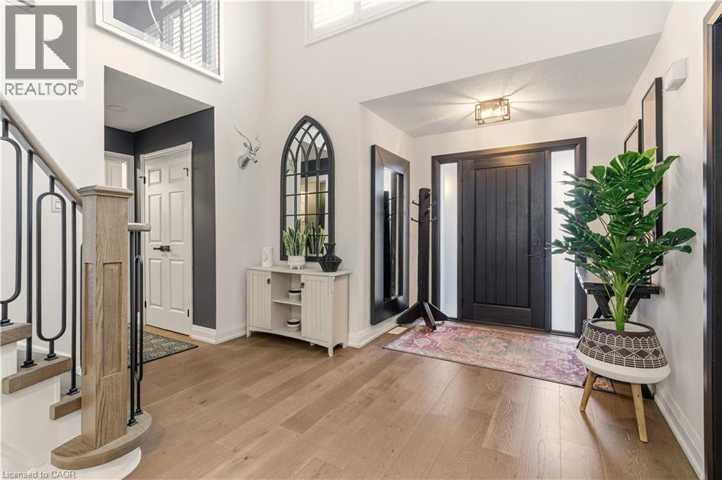 Foyer entrance featuring a towering ceiling, light wood-style flooring, and stairway