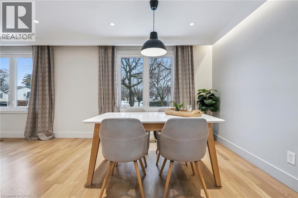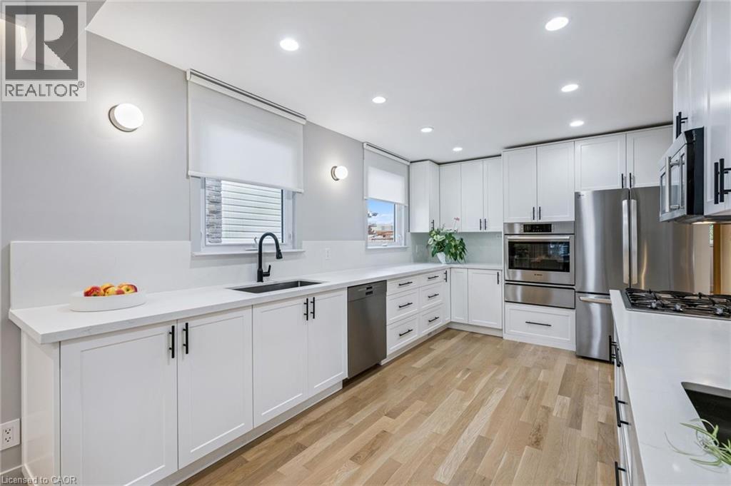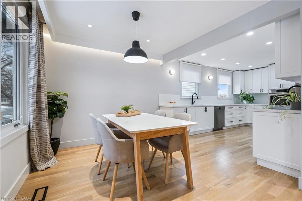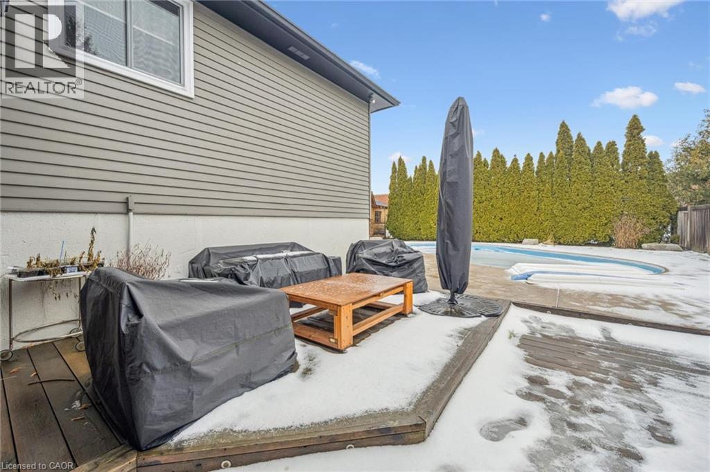 Beautifully Updated Raised Bungalow on a Quiet Crescent with In-ground Pool! Welcome to this thoughtfully upgraded 3+1 bedroom, 2-bathroom + office raised bungalow located on a quiet crescent in a desirable Burlington neighbourhood. With no rear neighbours and a private setting, this home offers comfort, quality, and functionality in equal measure. The bright, open-concept main level features refinished hardwood flooring (2022), interior pot lights throughout (2022), updated interior doors, and refined finish carpentry. Large windows fill the living and dining areas with natural light. The well-appointed kitchen includes stylish cabinetry, two separate sinks, a gas cooktop, and new premium appliances: fridge, dishwasher, and built-in wall oven (2025). The spacious primary bedroom features sound-insulated walls for enhanced privacy. Three additional bedrooms and an office (currently used as a walk-in closet) provide flexibility for family, guests, and work. The fully finished basement was refinished in 2022 (excluding the bathroom) and has been sound insulated from the main floor. Step outside to a private backyard retreat featuring an in-ground pool, two-tier deck, and concrete patio, perfect for entertaining. A unique bonus is the pool bar that's equipped with a roll-up door on the driveway side, allowing it to double as secure storage for bikes or a motorcycle. The current owners have made extensive updates including attic insulation (2022), updated stairs and railing (2022), a front door with a 3-point locking system (2022), furnace (2021), air conditioning (2017), owned hot water tank (2017), pool liner (2015), and roof (2012), basement and new finishes throughout. The property also offers a double-wide private driveway and carport. Conveniently located close to schools, parks, public transit, shopping, and major highway access, this move-in-ready home is a rare opportunity in a quiet, family-friendly neighbourhood. (id:63285)