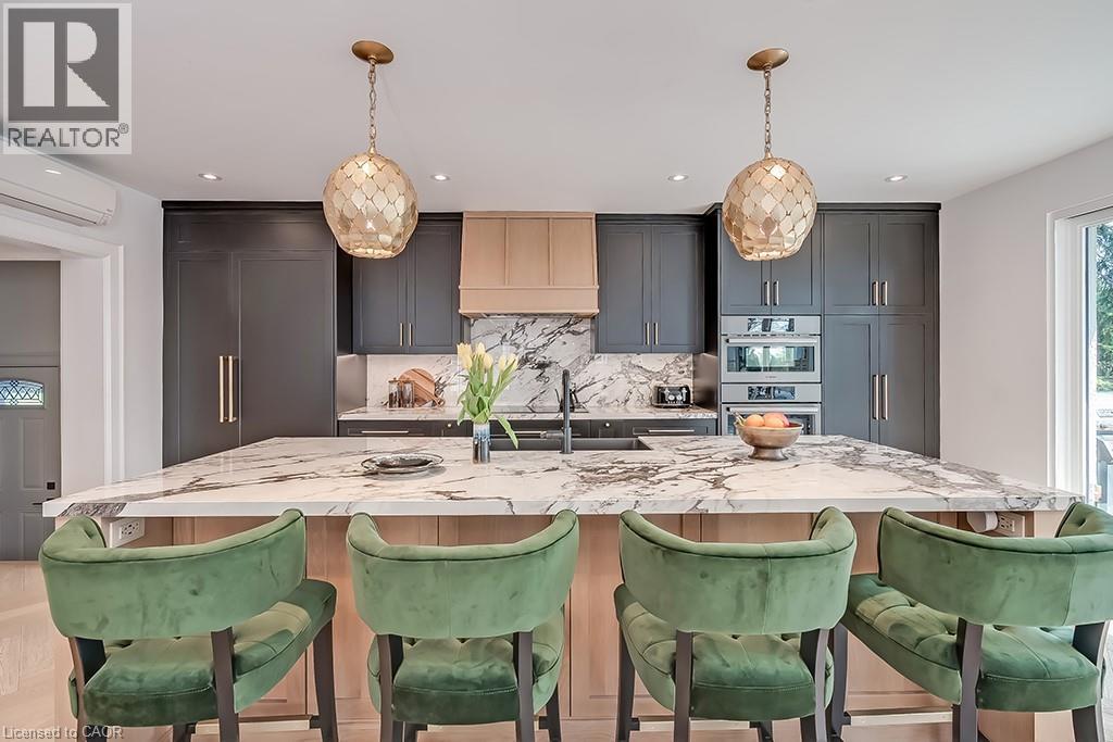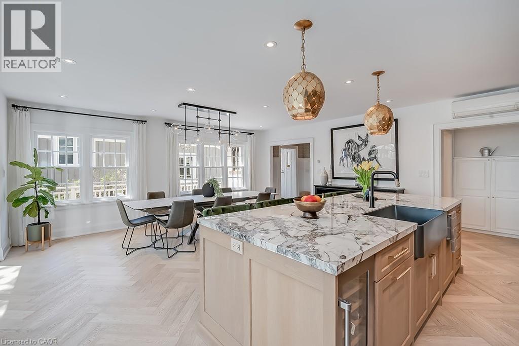 Welcome to this beautifully renovated 4 bedroom, 2.5 bath home offering over 3400 sq ft of living space, set amongst majestic trees and nestled within the historic gates of Indian Point. The main level showcases heated floors and exquisite herringbone hardwood, flowing into a custom designer kitchen featuring a large island, wall ovens, paneled fridge and dishwasher, and striking light fixtures. Oversized sliding patio doors open wide to create seamless indoor outdoor living. The cozy living room features a gas fireplace with a floor to ceiling surround and inset for your TV. The second floor includes three generous bedrooms with walk in closets, hardwood throughout and a stunning updated main bath with heated floors. The third level offers a private bedroom retreat with a den area and walk in closet ideal for guests or a home office. The finished lower level has a spacious recreation room, 3 piece bath, and ample storage. A double garage provides convenience, while the prime location offers quick access to Spencer Smith Park, major highways, downtown Burlington, and its vibrant shops and restaurants. This home combines luxury, location, and lifestyle! (id:63285)