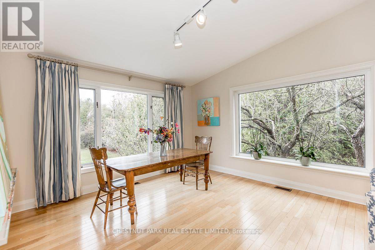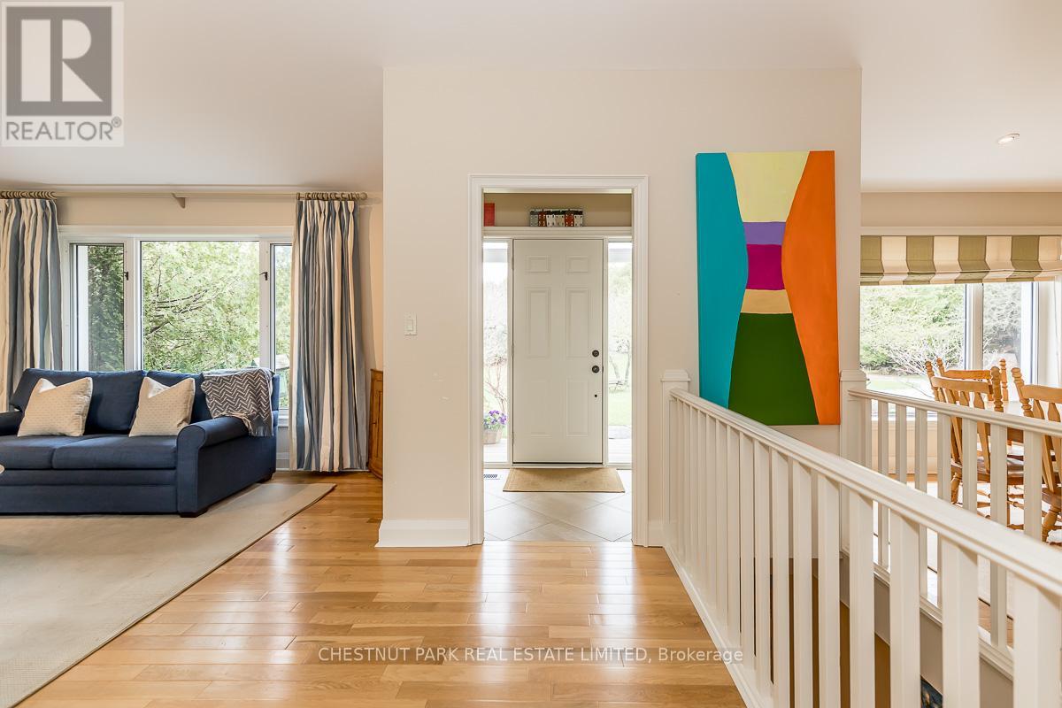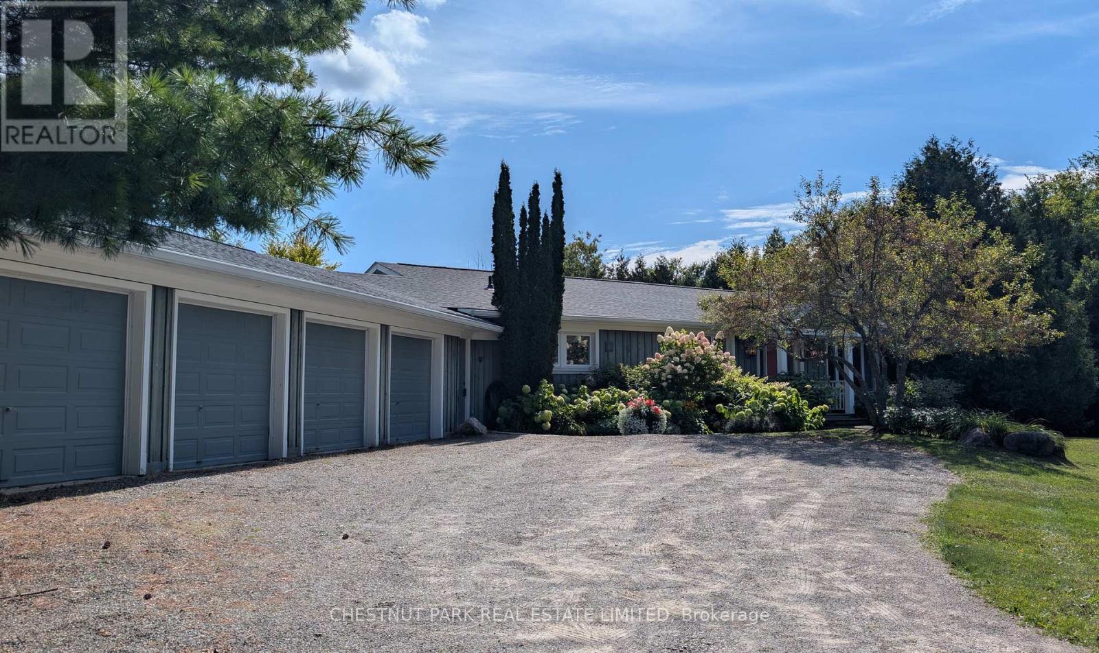 Beautiful in every season, this bright and welcoming bungalow offers space, privacy, and everyday comfort in a peaceful rural setting. Set on 3.76 acres of serene countryside, vaulted ceilings and an open-concept main floor create an airy, sun-filled atmosphere ideal for both daily living and entertaining. The living room is anchored by a cozy wood-burning fireplace and framed by large windows overlooking the property. The spacious kitchen, complete with a dedicated eating area, provides an excellent foundation for a future dream culinary space. Step outside to the covered deck - perfect for morning coffee, quiet evenings, or enjoying the surrounding natural landscape. A functional mudroom with built-in storage connects seamlessly to the attached four-car garage, offering convenience and organization. The fully finished lower level expands the living space with a generous family room featuring a gas fireplace, built-in entertainment unit, and walk-out access to a level, tree-lined yard - ideal for children, pets, or outdoor enjoyment. Well-maintained and full of potential, this property presents a wonderful opportunity to create a private family retreat with room to grow. (id:63285)