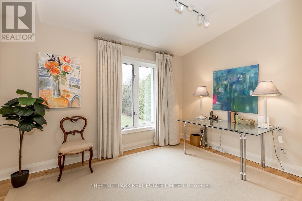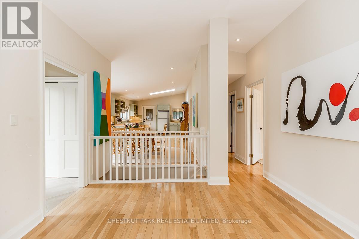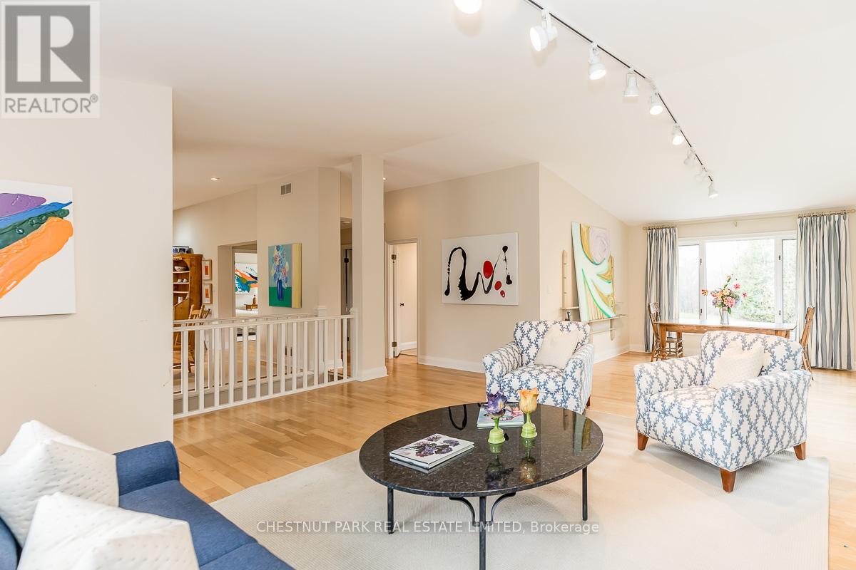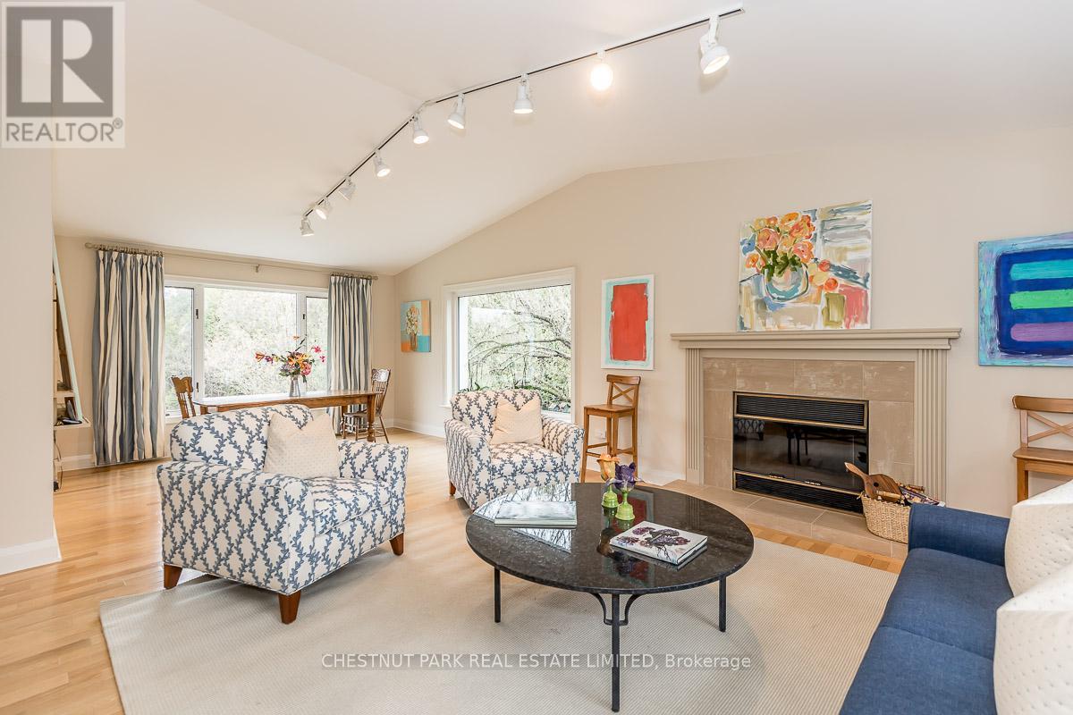 Beautiful in every season, this bright and welcoming bungalow offers space, privacy, and everyday comfort in a peaceful rural setting. Set on 3.76 acres of serene countryside, vaulted ceilings and an open-concept main floor create an airy, sun-filled atmosphere ideal for both daily living and entertaining. The living room is anchored by a cozy wood-burning fireplace and framed by large windows overlooking the property. The spacious kitchen, complete with a dedicated eating area, provides an excellent foundation for a future dream culinary space. Step outside to the covered deck - perfect for morning coffee, quiet evenings, or enjoying the surrounding natural landscape. A functional mudroom with built-in storage connects seamlessly to the attached four-car garage, offering convenience and organization. The fully finished lower level expands the living space with a generous family room featuring a gas fireplace, built-in entertainment unit, and walk-out access to a level, tree-lined yard - ideal for children, pets, or outdoor enjoyment. Well-maintained and full of potential, this property presents a wonderful opportunity to create a private family retreat with room to grow. (id:63285)