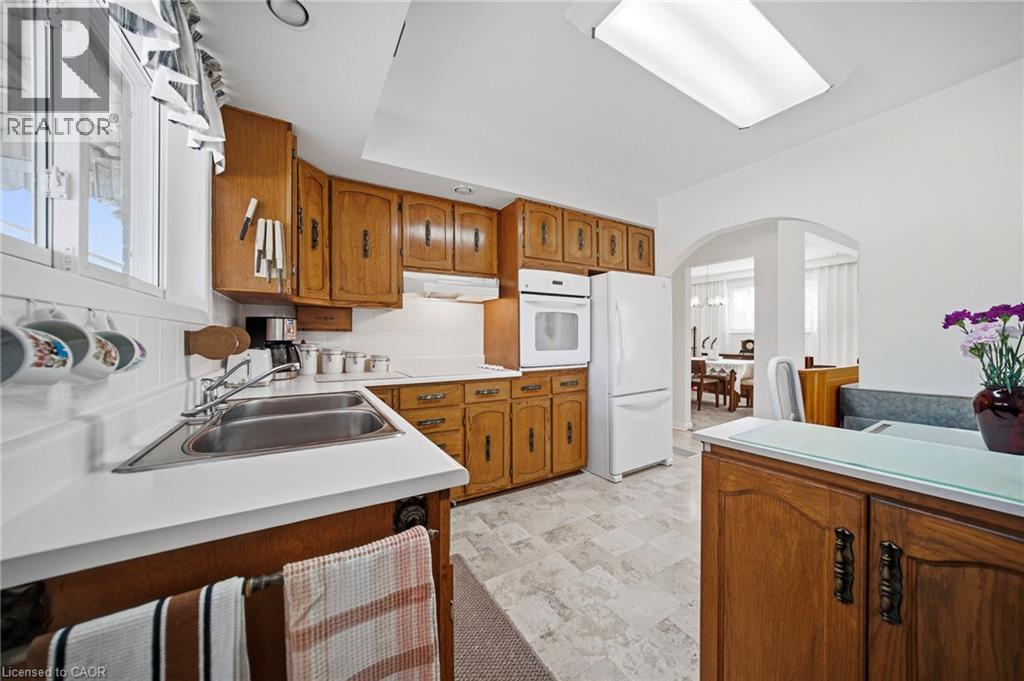 Kitchen featuring brown cabinets, arched walkways, healthy amount of natural light, and white appliances
