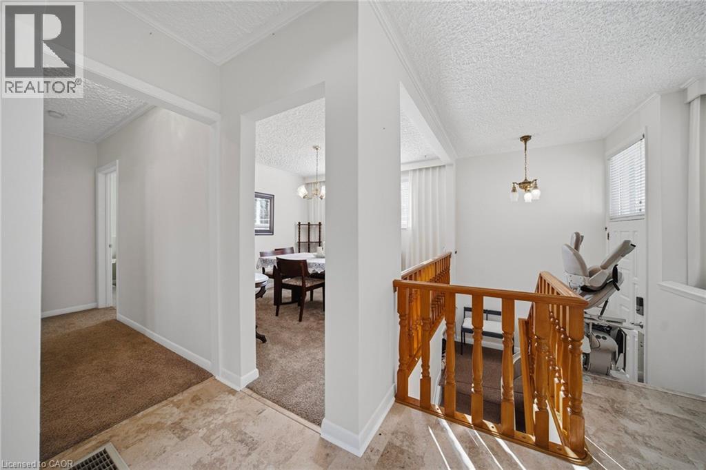 Hallway with an upstairs landing, a textured ceiling, a chandelier, carpet floors, and healthy amount of natural light