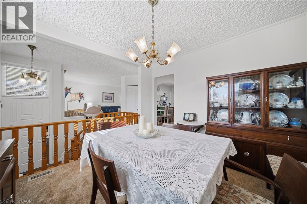 Dining room with carpet, a textured ceiling, a chandelier, and crown molding