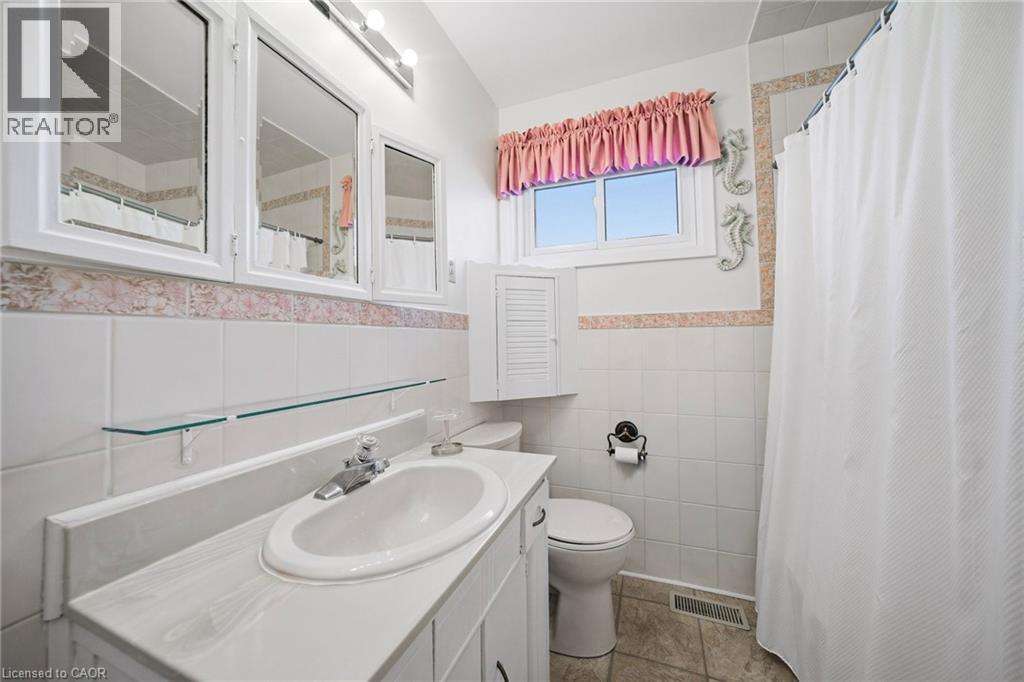 Full bath featuring vanity, a wainscoted wall, curtained shower, and tile walls
