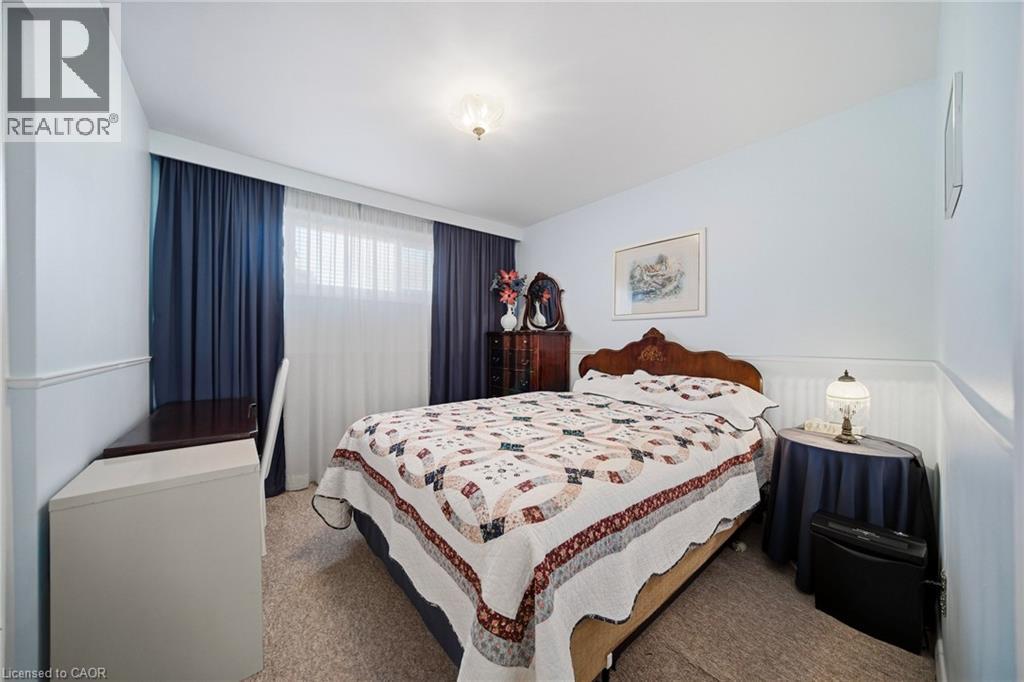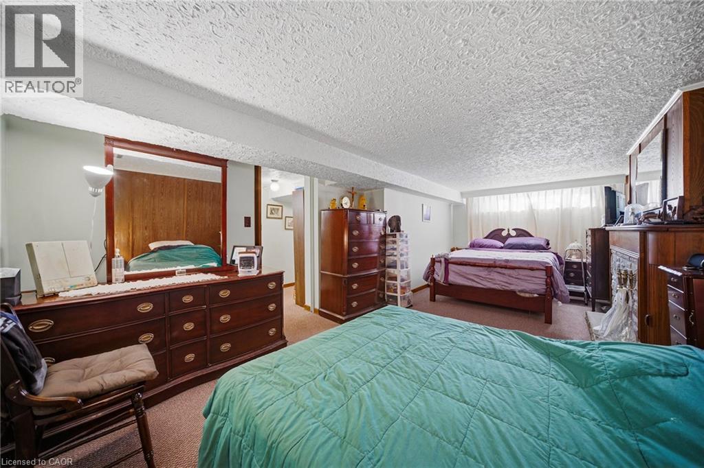 Carpeted bedroom with a textured ceiling, wood walls, and ornamental molding