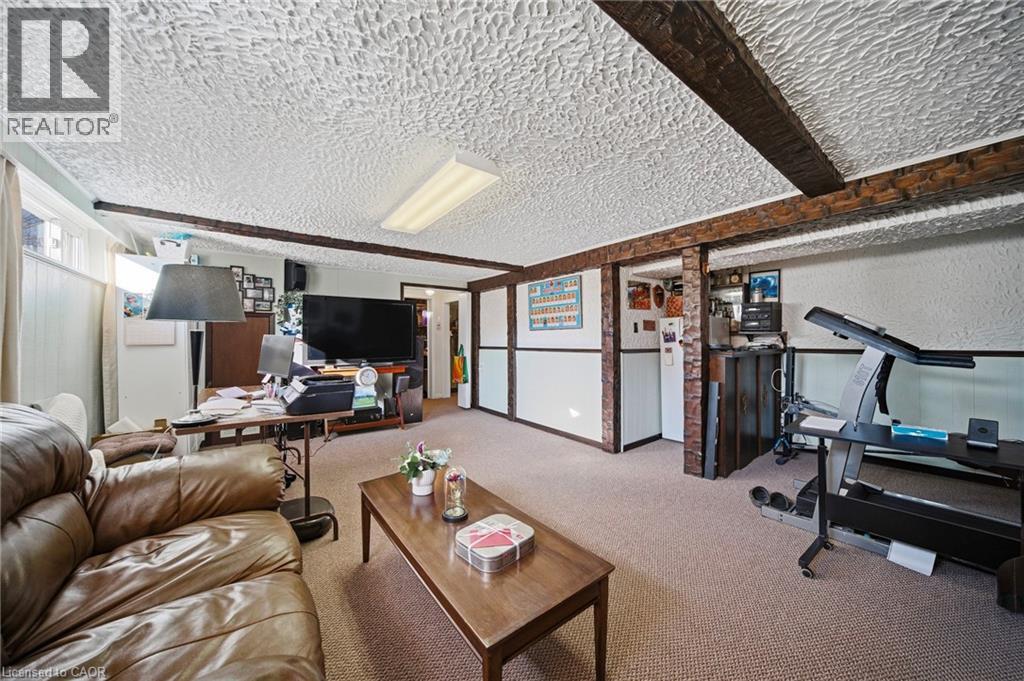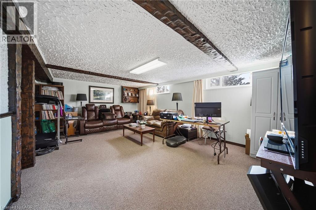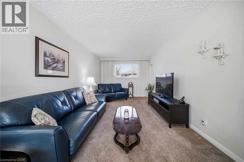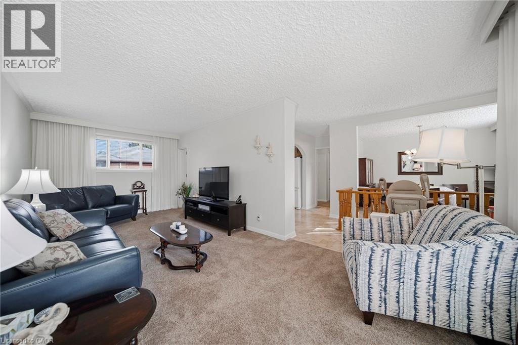 Carpeted living room with arched walkways, a textured ceiling, and a chandelier