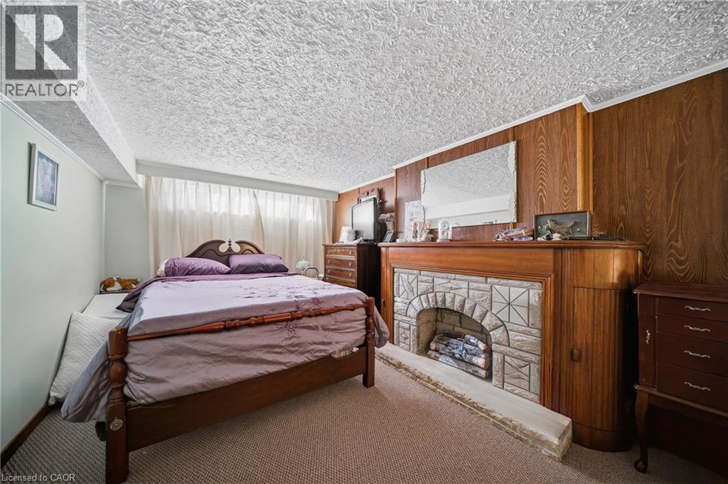Bedroom with crown molding, carpet flooring, a stone fireplace, wood walls, and a textured ceiling