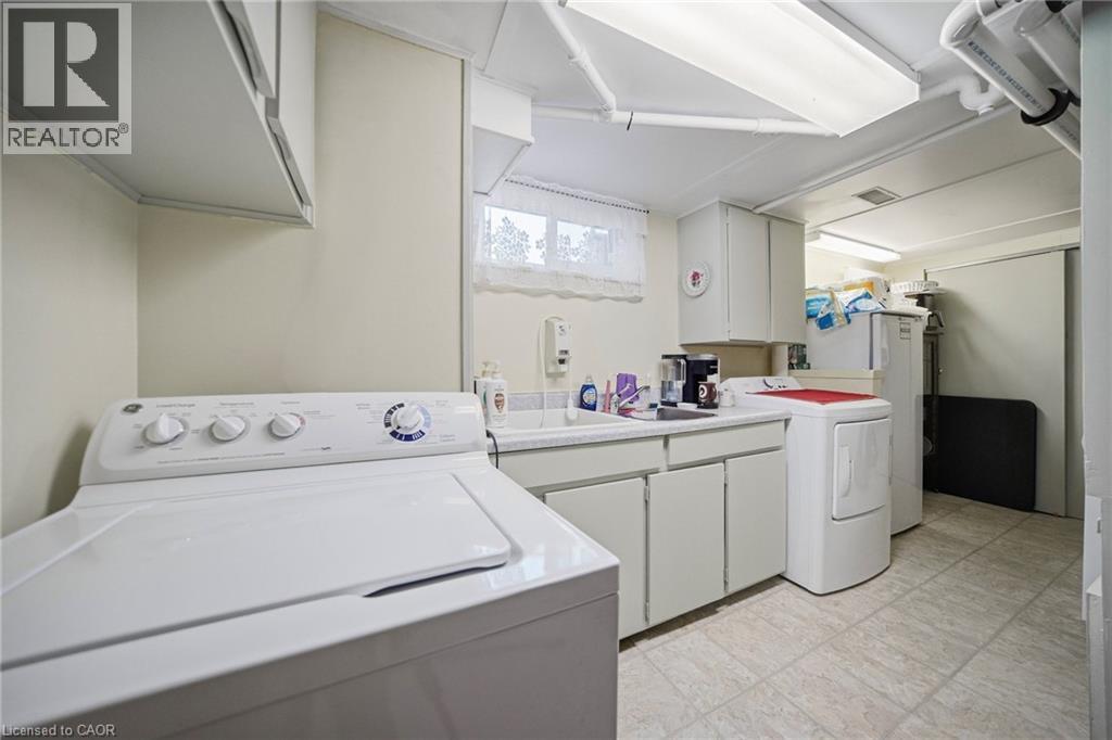 Kitchen with white appliances, brown cabinetry, light countertops, and stone finish floors