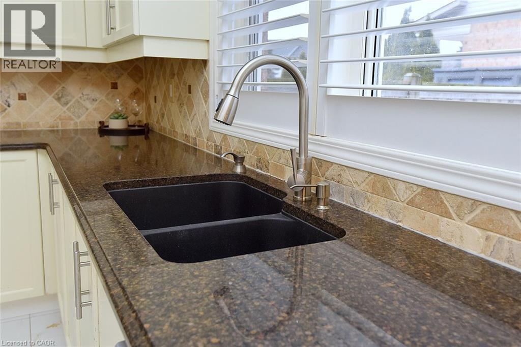 Kitchen view of tasteful backsplash, dark stone counters, and white cabinets