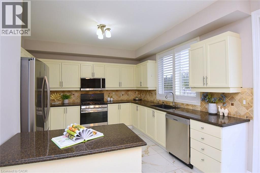 Kitchen featuring appliances with stainless steel finishes, dark stone countertops, light marble finish floors, and tasteful backsplash