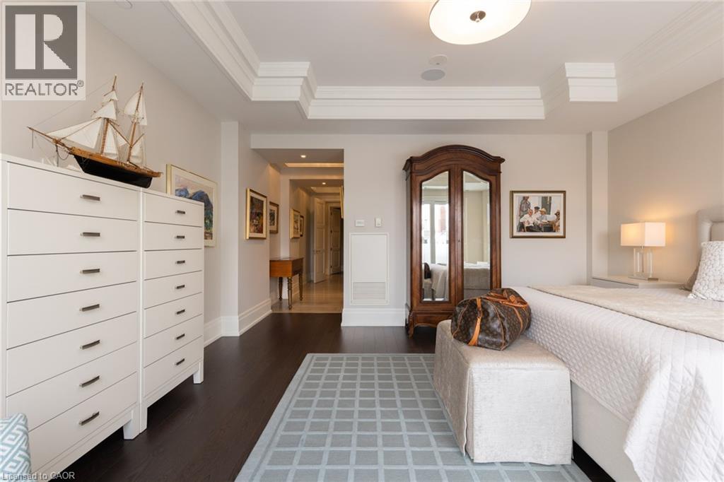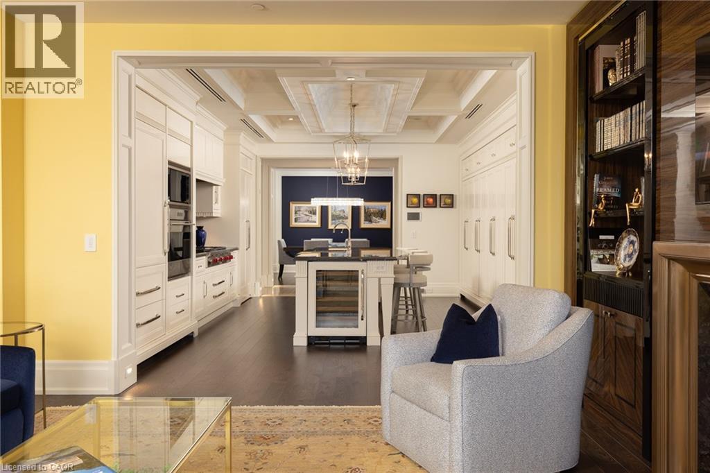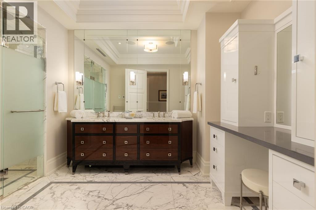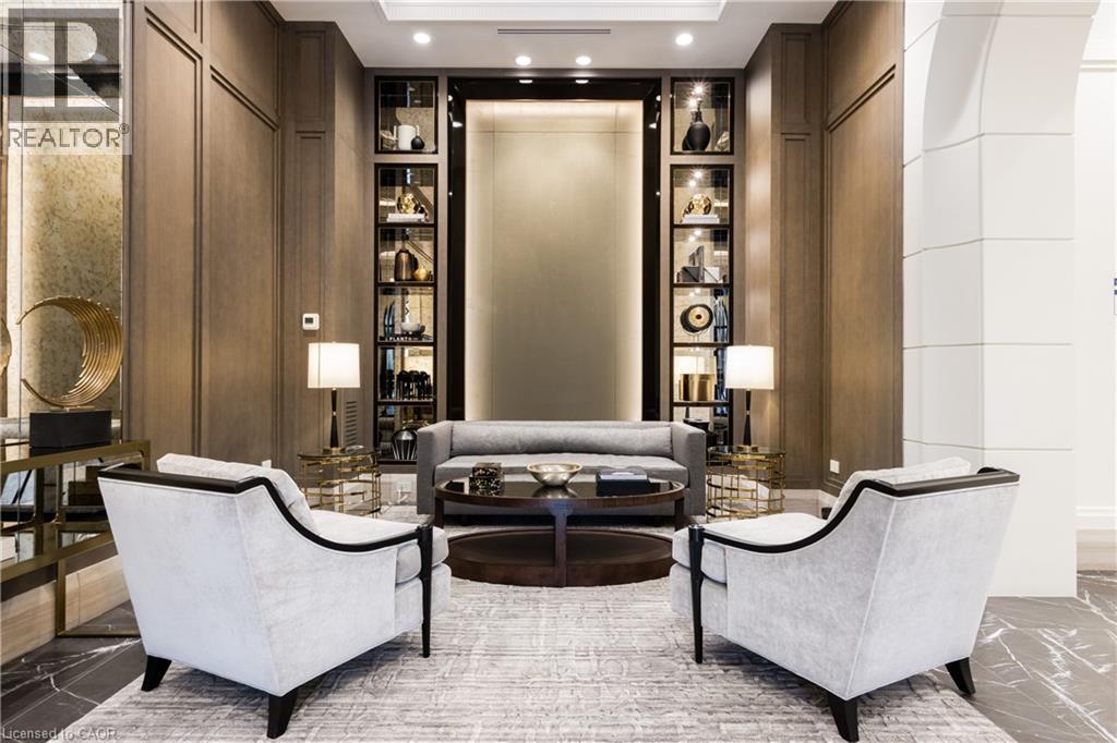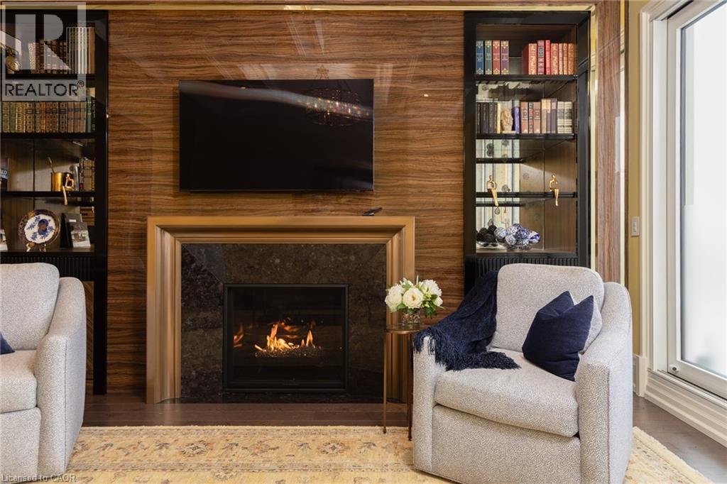 Discover True Luxury Living in This Exceptional Oakville Suite. Welcome to an extraordinary residence that redefines sophisticated condominium living. This stunning two-bedroom suite encompasses an impressive 2,290 square feet of meticulously designed living space, where every detail has been carefully curated to create an atmosphere of refined elegance. Upon entering through the grand rotunda, you are immediately greeted by exquisite slab marble flooring that establishes the tone for the opulence that awaits within. The thoughtful design continues throughout, featuring rich hardwood flooring, intricate millwork, and striking zebra wood accents that speak to the exceptional craftsmanship found in this home. The gourmet kitchen presents a culinary enthusiast's dream, complete with top-of-the-line Wolf, Subzero, and Miele appliances, a generous island for meal preparation and casual gatherings, plus an entire wall of pantry cupboards, and walk-in pantry for additional storage. The Great Room beckons relaxation with built-in cabinetry, and a warm gas fireplace. Step through to the private 335 sq ft terrace for morning coffee or evening contemplation. Entertain graciously in the separate dining room, showcasing zebra wood built-in cabinetry with dedicated wine storage. The primary bedroom suite offers terrace access, a walk-in closet, and a luxurious 4 pc ensuite featuring a vanity area, radiant heated floors and a pampering Kohler toilet ($8500 value). The 2nd bedroom functions beautifully as a home office with custom built-ins and its own 3 pc ensuite. Modern convenience abounds with the integrated Crestron system controlling music, lighting, and motorized blinds throughout. 2 side-by-side parking spaces and a storage locker complete this offering. Built by the acclaimed Rosehaven Homes, this residence sits moments from Lake Ontario, fine dining, boutique shopping, & provides effortless access to major transportation routes including the nearby transit station. (id:63285)