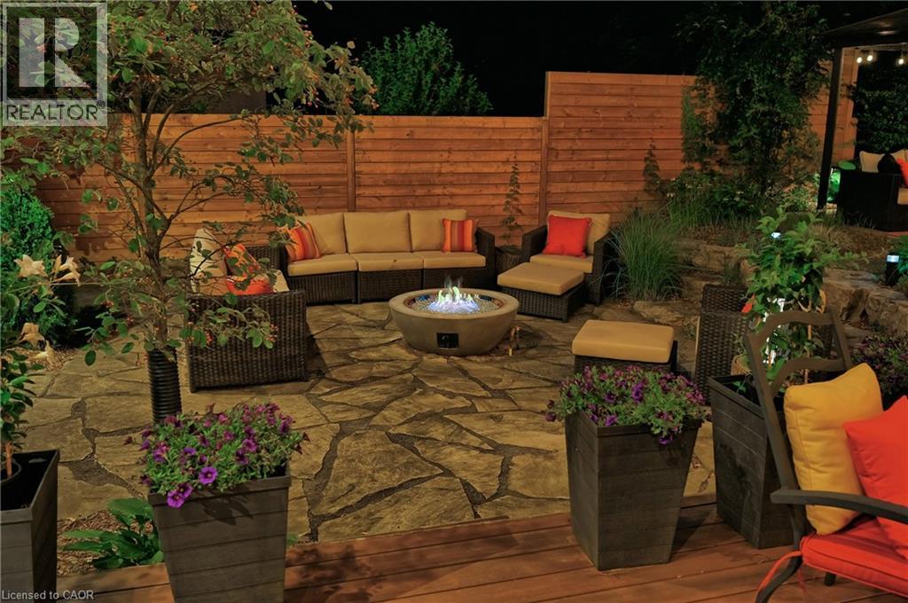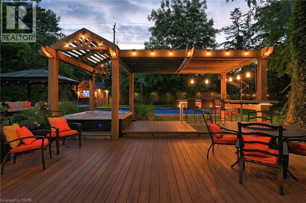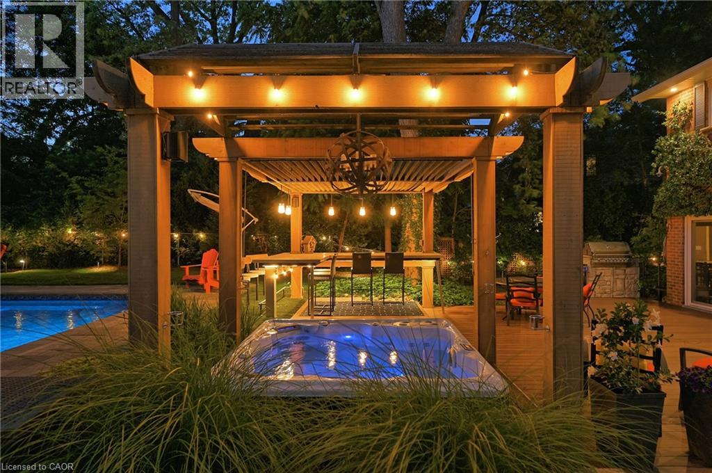 Located south of Lakeshore Road in a prestigious enclave of Ford, this executive family home blends traditional comfort with contemporary refinement. Set back on a mature lot framed by evergreens, it’s a short stroll to the shores of Lake Ontario and positioned within a well-known, family-friendly pocket. A boulder-lined drive and flat stone pavers lead to the cedar-planked front portico, opening to a refined + cohesive interior. Expansive glazing fills the principal living spaces with natural light, complemented by detailed millwork, white oak hardwood flooring + neutral tile throughout. The living room features a picturesque bay window with upholstered seating, while the formal dining room is ideal for entertaining. A cozy wood-burning fireplace anchors the family room with serene rear garden views. The eat-in kitchen offers abundant custom cabinetry and a large glass slider for seamless access to the rear deck. A functional utility wing includes a mudroom, rear access + powder room. The primary retreat offers tranquil backyard views, full-wall built-in closets + a spa-inspired ensuite with oversized steam shower. Three additional bedrooms share a beautifully appointed main bath + second-level laundry adds everyday ease. Featured on HGTV, the lower level extends the home’s refined living space with a stone-clad wood-burning fireplace, expansive rec room with projector and surround sound + an outfitted wet bar, ideal for gatherings. A gym + guest bedroom with semi-ensuite complete the level. The backyard unfolds like a private resort, anchored by a crisp rectangular pool, pergola-covered hot tub, outdoor kitchen, dining area, lounge pavilion + seated bar, all framed by natural stone terraces + mature greenery. Designed for both grand entertaining + quiet daily rituals, this is a sophisticated home with an immaculately private, resort-style backyard in one of Oakville’s most family-focused neighbourhoods. (id:63285)