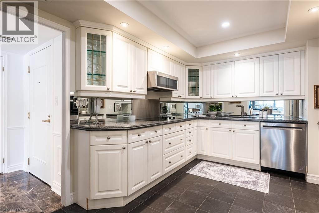 There's a certain calm that comes from living beside the water - and Suite 201 at 100 Lakeshore Road East captures it beautifully.Set within The Granary, one of Oakville's most established and sought-after waterfront residences, this second-floor suite offers a rare combination of privacy, scale, and permanently protected harbour views. Overlooking Sixteen Mile Creek, with mature trees framing the outlook, the setting feels peaceful and removed - yet steps from downtown, the harbour, and Lakeshore amenities.Inside, approximately 1,760 square feet of renovated living space is defined by generous proportions and exceptional natural light. The living and dining rooms flow effortlessly, ideal for both quiet evenings and hosting family and friends. Wide-plank light oak hardwood flooring, updated finishes, and a refreshed kitchen with updated stainless steel appliances bring a clean, timeless feel throughout.What truly sets this home apart are the outdoor spaces. Two expansive west-facing terraces - totalling approximately 365 square feet - extend the living experience outdoors. With five walk-outs, no overhang above, and open skies overhead, these terraces are sun-drenched, private, and perfectly positioned for afternoon light and evening sunsets.The primary bedroom offers a true retreat, complete with a walk-in closet, four-piece ensuite, and terrace access. A second bedroom with its own walk-out and walk-in closet provides versatility, while a dedicated laundry room and abundant storage add everyday convenience.Parking and locker are located on the same level as the suite, eliminating the need for elevators, and a nearby side stairwell provides direct access to Lakeshore Road. Quiet, private, and timelessly positioned, this is waterfront condo living without compromise. (id:63285)