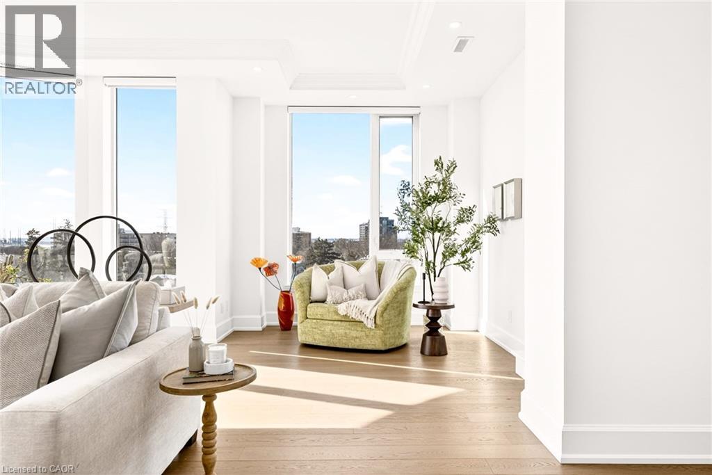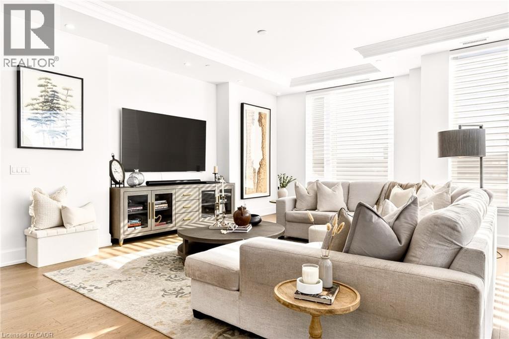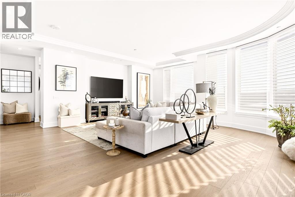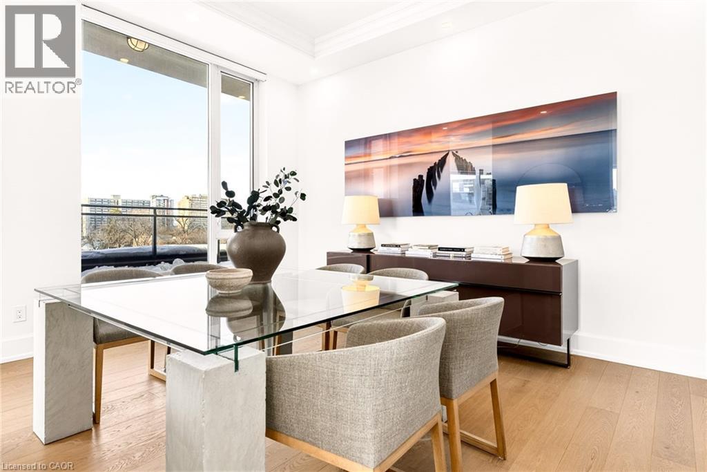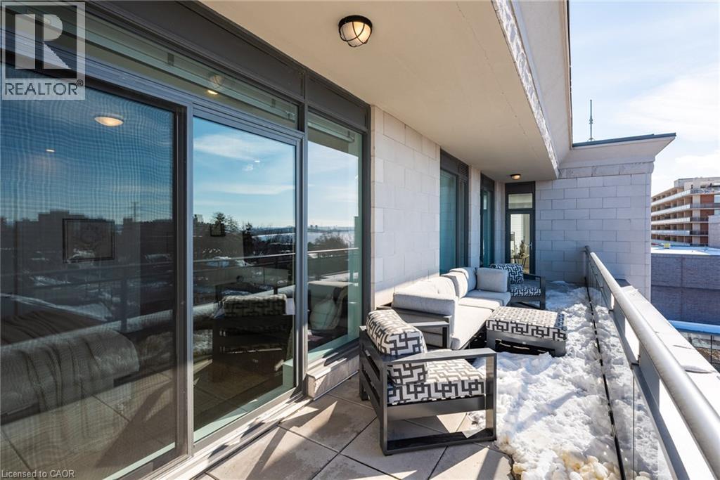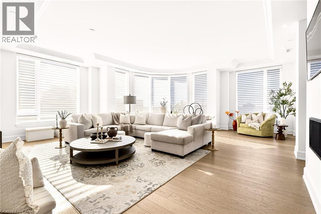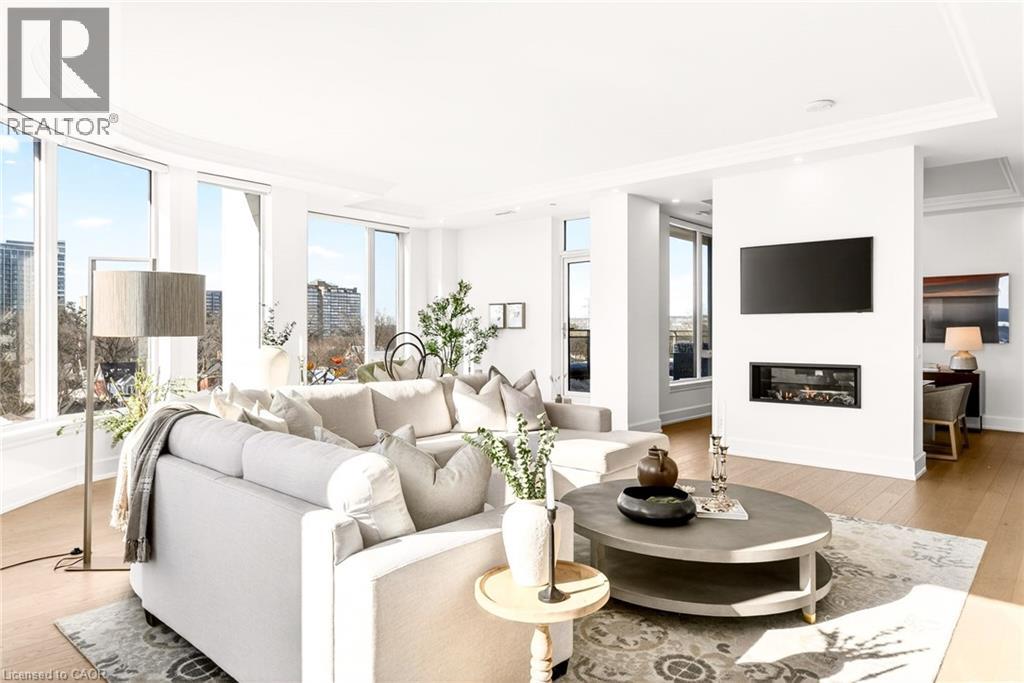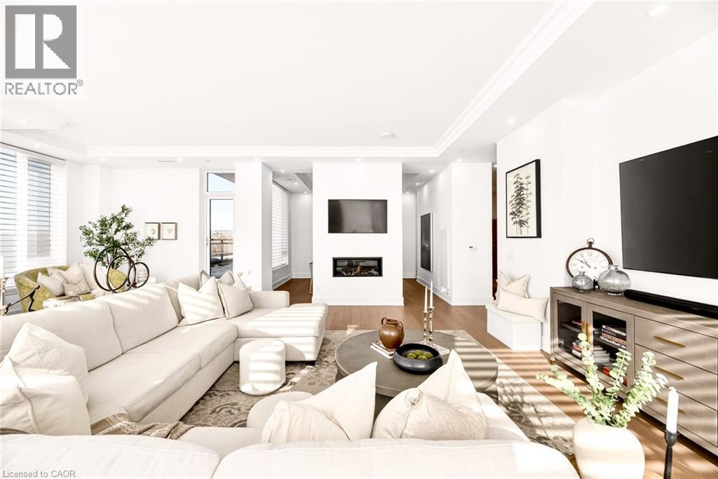 Perched above the city at the prestigious Saxony, this extraordinary 2,578 sq. ft. penthouse redefines what condominium living can feel like. Here, life unfolds with space, light, and effortless elegance. Ten-foot ceilings and expansive principal rooms create an immediate sense of calm and grandeur, while walls of windows draw in the ever-changing sky. As evening falls, step onto the 300 sq. ft. southwest-facing terrace and watch the sun melt into the horizon, city lights beginning to sparkle below, a glass of wine in hand. The nearly 28-foot great room was designed for both intimate evenings and unforgettable gatherings. A double-sided fireplace flickers between living and dining spaces, adding warmth and ambiance whether you’re hosting a dinner party or enjoying a quiet night in. The open-concept kitchen, anchored by premium integrated appliances and generous prep space, becomes the heart of the home, where conversation flows as easily as the layout itself. The versatile 2+1 bedroom design adapts beautifully to your lifestyle. The den is spacious enough to function as a true third bedroom, private office, or creative retreat. The primary suite is a serene sanctuary, complete with a walk-in closet and spa-inspired ensuite designed for slow mornings and restorative evenings. A thoughtfully appointed second bedroom ensures guests or family feel equally at home. Custom closets and automated blinds throughout reflect a level of finish that is both refined and practical. Beyond the suite, three oversized parking spaces, including an EV charger, and a large private locker provide rare convenience and flexibility. Residents enjoy concierge services, a fitness studio, and a rooftop lounge that extends your living space even further. Steps to the lake, the Burlington Performing Arts Centre, boutique shopping, and celebrated dining, this penthouse offers the privacy and scale of a home paired with the vibrancy of downtown living — a place where every day feels elevated. (id:63285)