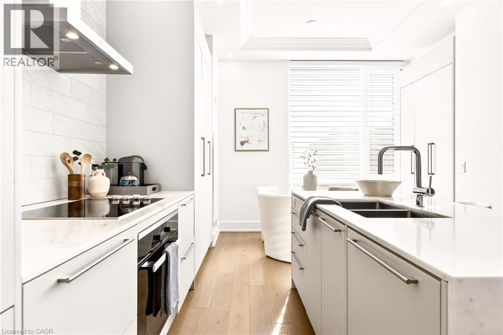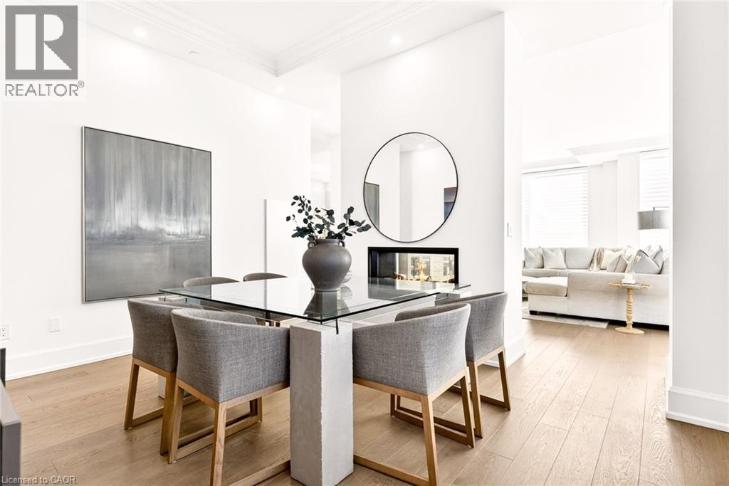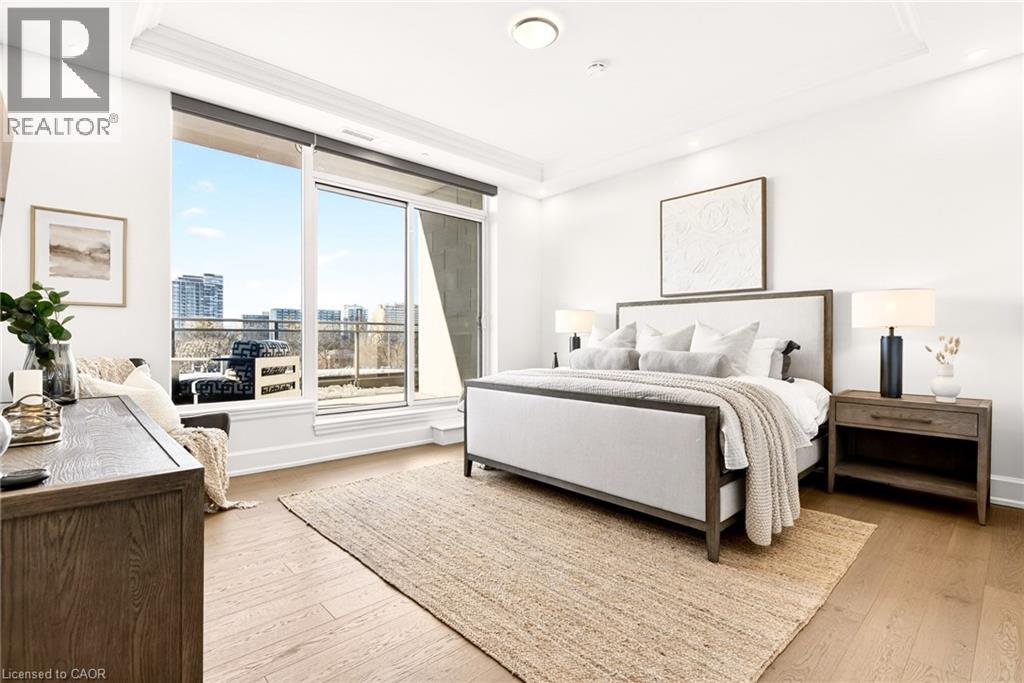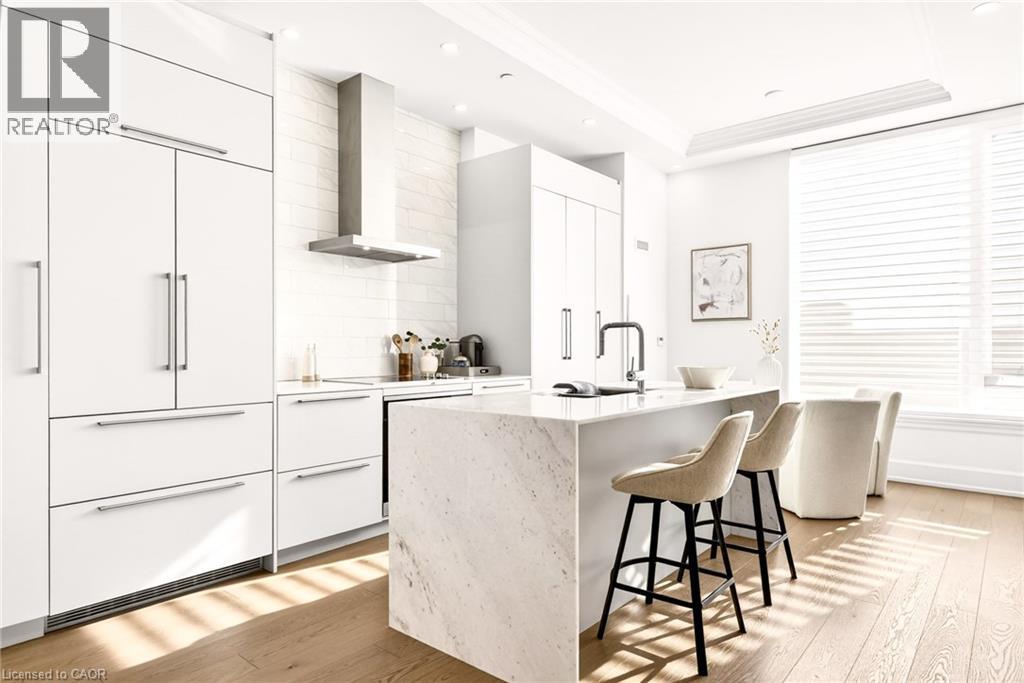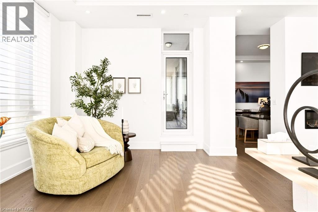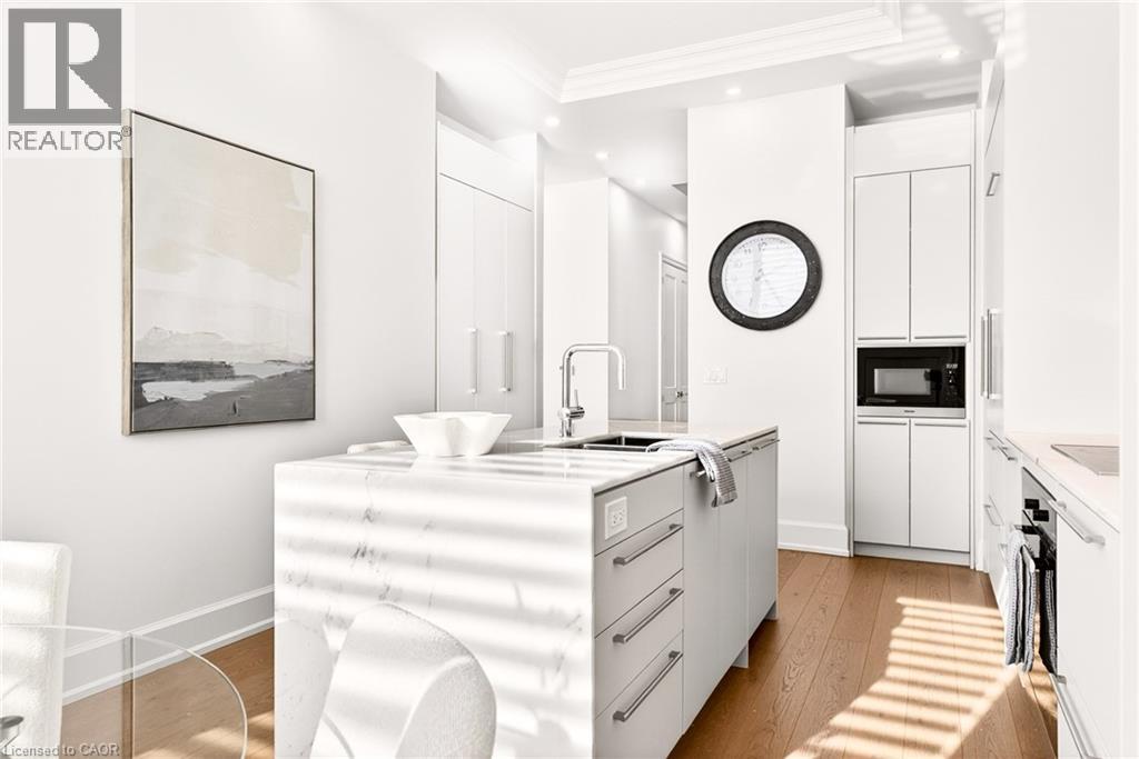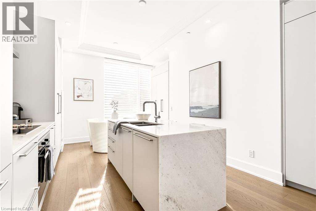 Perched above the city at the prestigious Saxony, this extraordinary 2,578 sq. ft. penthouse redefines what condominium living can feel like. Here, life unfolds with space, light, and effortless elegance. Ten-foot ceilings and expansive principal rooms create an immediate sense of calm and grandeur, while walls of windows draw in the ever-changing sky. As evening falls, step onto the 300 sq. ft. southwest-facing terrace and watch the sun melt into the horizon, city lights beginning to sparkle below, a glass of wine in hand. The nearly 28-foot great room was designed for both intimate evenings and unforgettable gatherings. A double-sided fireplace flickers between living and dining spaces, adding warmth and ambiance whether you’re hosting a dinner party or enjoying a quiet night in. The open-concept kitchen, anchored by premium integrated appliances and generous prep space, becomes the heart of the home, where conversation flows as easily as the layout itself. The versatile 2+1 bedroom design adapts beautifully to your lifestyle. The den is spacious enough to function as a true third bedroom, private office, or creative retreat. The primary suite is a serene sanctuary, complete with a walk-in closet and spa-inspired ensuite designed for slow mornings and restorative evenings. A thoughtfully appointed second bedroom ensures guests or family feel equally at home. Custom closets and automated blinds throughout reflect a level of finish that is both refined and practical. Beyond the suite, three oversized parking spaces, including an EV charger, and a large private locker provide rare convenience and flexibility. Residents enjoy concierge services, a fitness studio, and a rooftop lounge that extends your living space even further. Steps to the lake, the Burlington Performing Arts Centre, boutique shopping, and celebrated dining, this penthouse offers the privacy and scale of a home paired with the vibrancy of downtown living — a place where every day feels elevated. (id:63285)