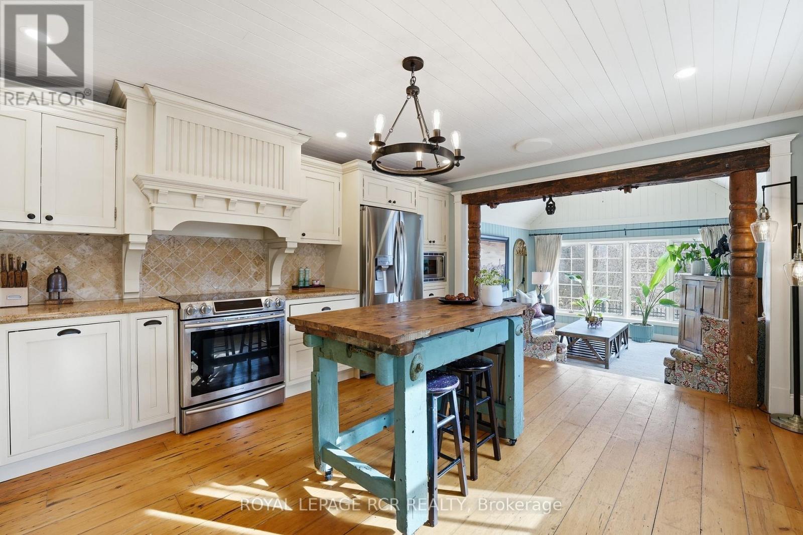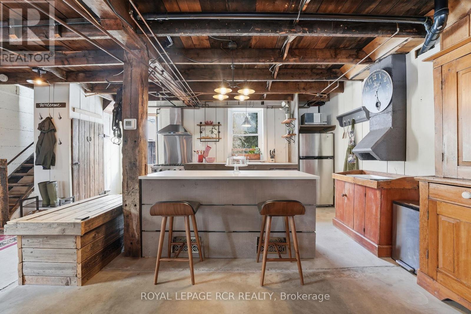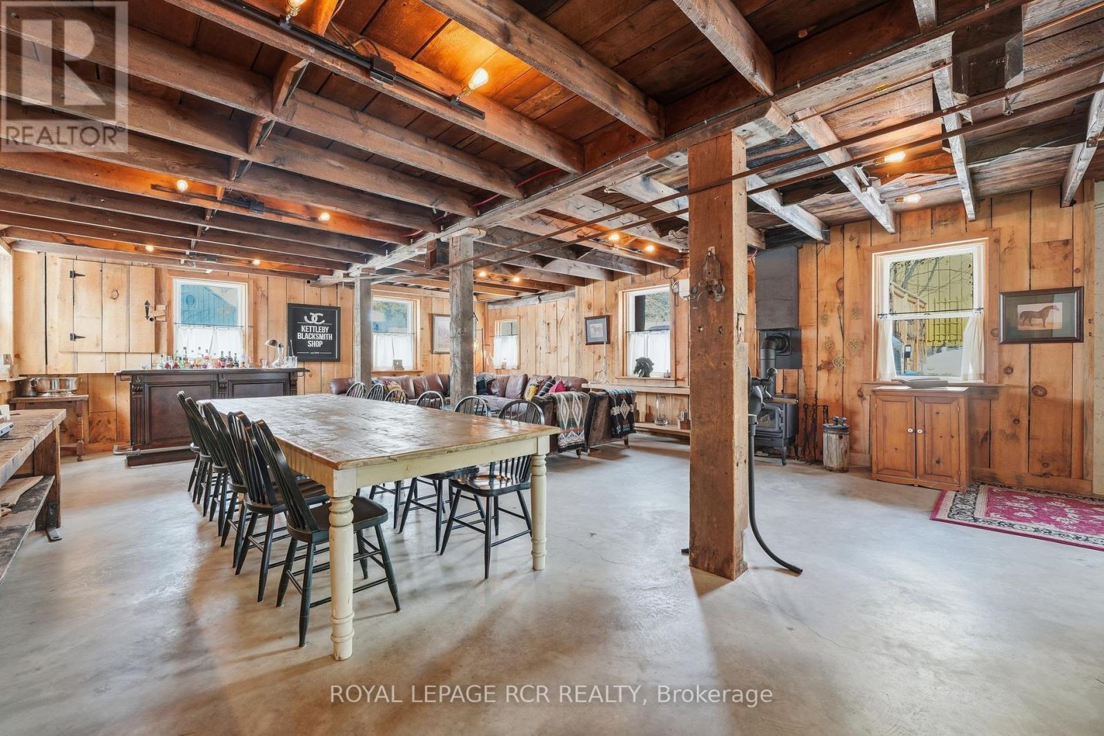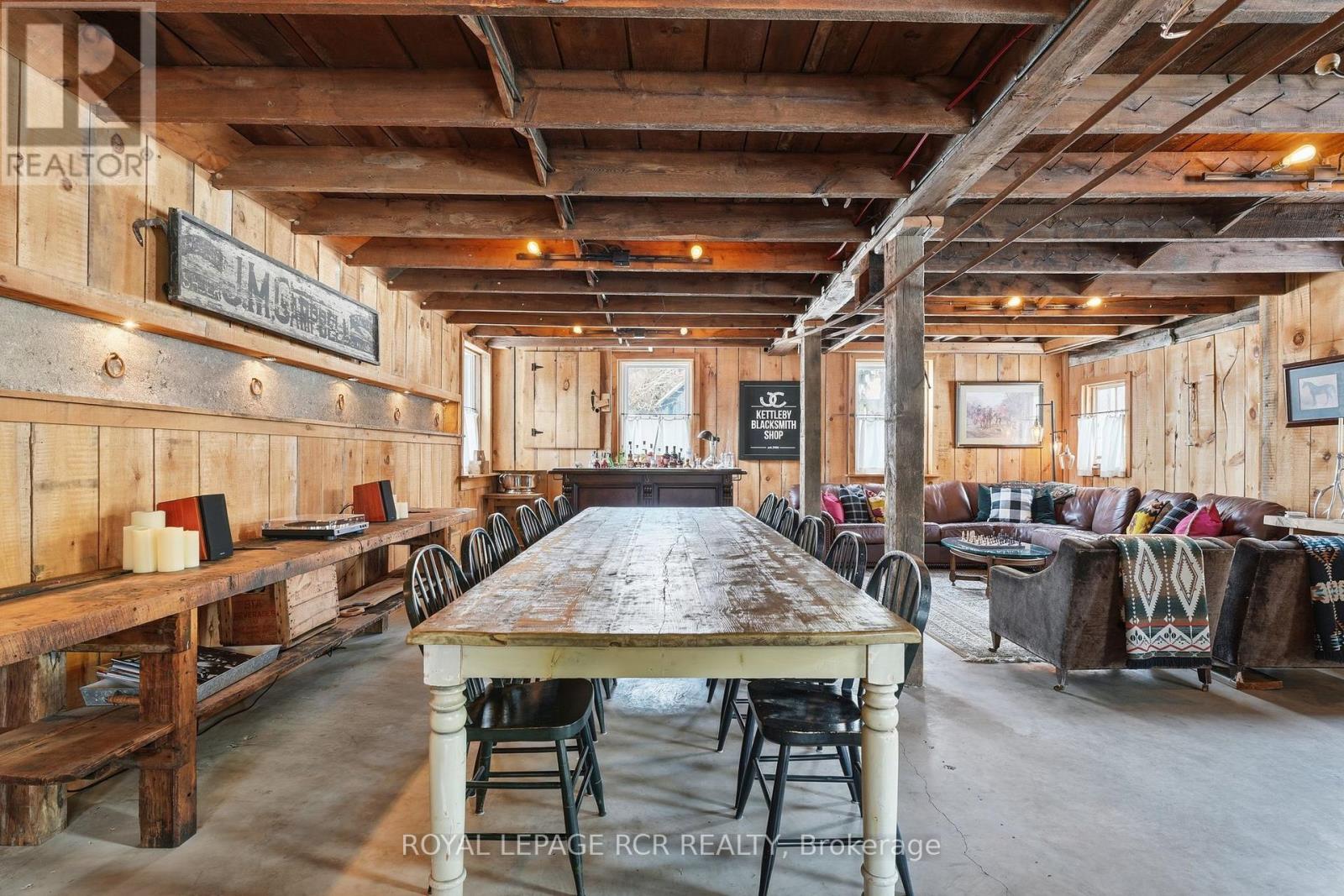 435 Kettleby Road is a rare offering where history and home intertwine. Once owned and operated by blacksmith John Stone Clift in the late 1800s, the property carries the legacy of a trade that helped shape the community. The thoughtfully updated main residence blends historic charm with modern comfort. The home features two bedrooms, including a spacious primary retreat with a large walk-in closet (converted from a 3rd bedroom) and 5-piece ensuite. Bright living and dining spaces are filled with natural light, while the kitchen offers a walkout to a large deck with seating and cooking areas. A family room with vaulted ceilings overlooks the backyard and surrounding greenspace. The historic blacksmith shop has been beautifully reimagined as a unique secondary space full of character and possibility. Heated floors run throughout the expansive main level, featuring a bar, large dining table, and generous seating area for entertaining. The kitchen includes a Viking gas stove and hood, centre island, and three-panel undercounter fridge. Upstairs offers a spacious open concept space that can accommodated a seating area, bedroom with walk-in closet and 4-piece bathroom. Whether envisioned as a private studio, creative workspace, boutique business setting, or guest or in-law accommodation, the former workshop provides exceptional flexibility. A truly special property surrounded by the natural beauty of King Township, 435 Kettleby Road offers a rare combination of character and versatility-an opportunity unlike anything else on the market. (id:63285)