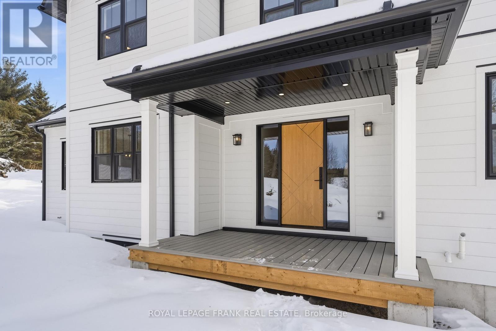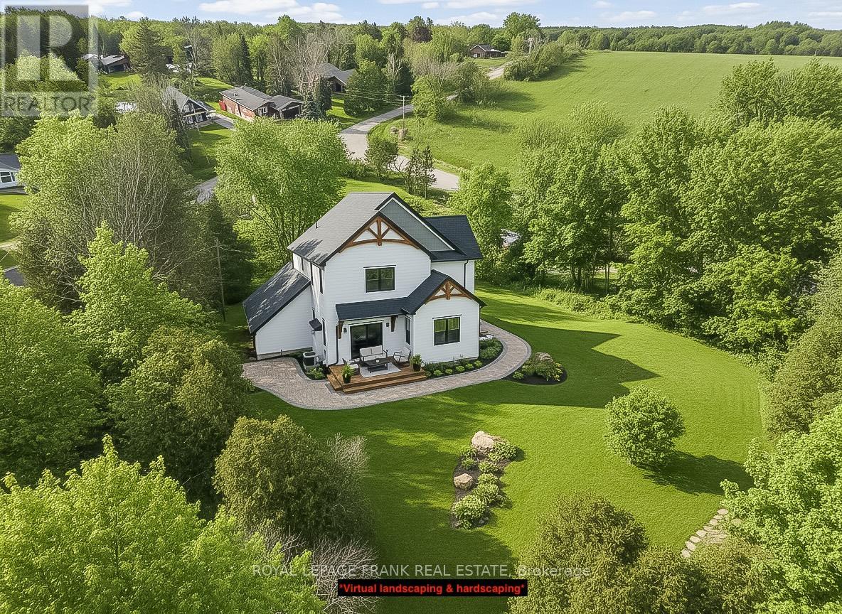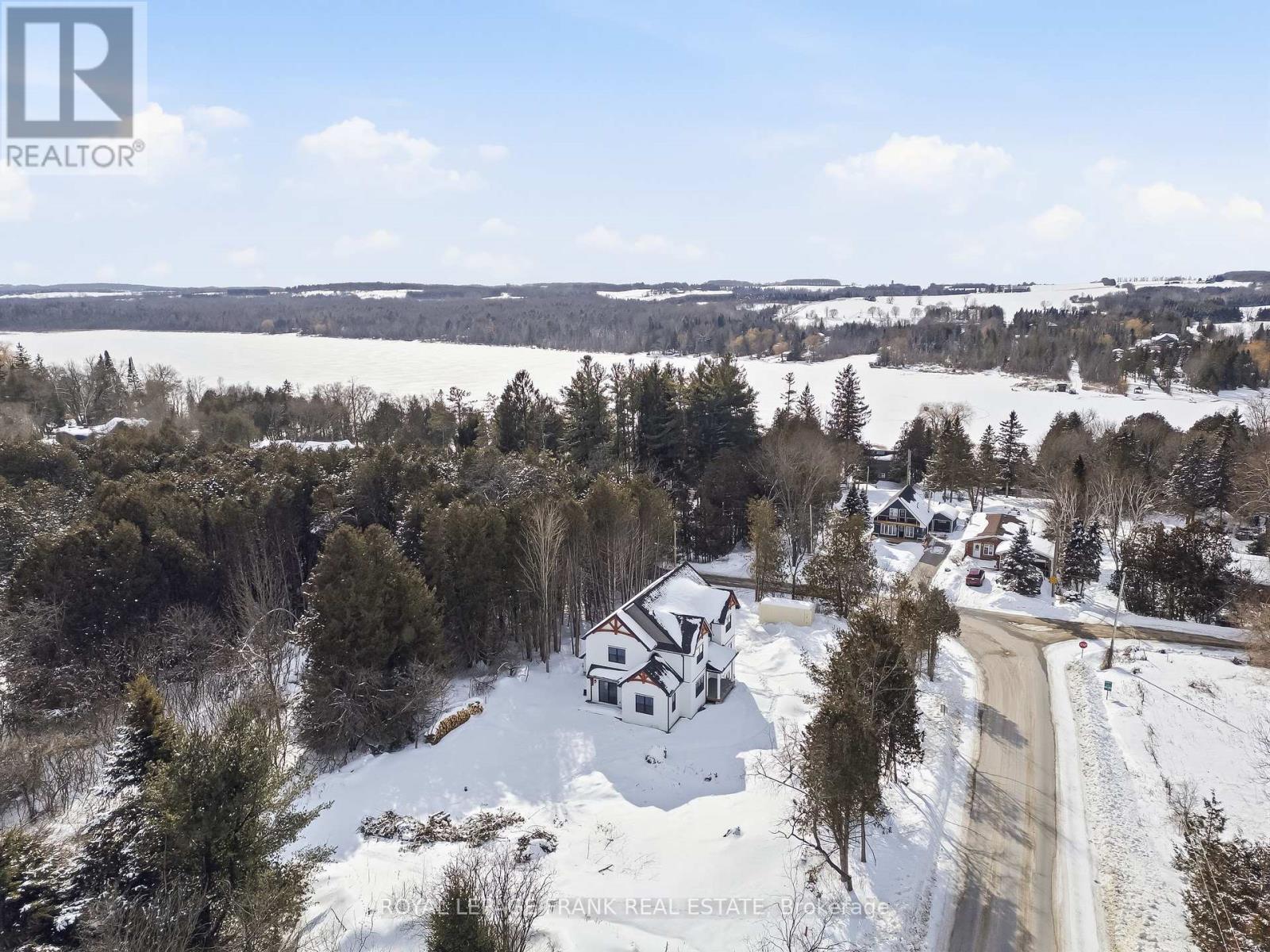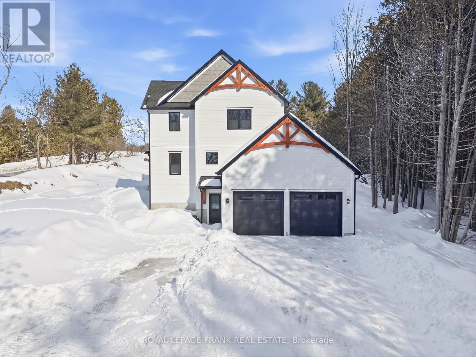 Welcome to this stunning custom-built 2-storey home, perfectly situated just minutes north of Uxbridge and directly across from Wagner's Lake. Set on a private 0.5-acre corner lot surrounded by mature trees, this home offers the ideal blend of luxury, functionality, and peaceful country living. With 2,660 sq ft above grade, the home features hardwood flooring throughout, striking black windows, and 9-foot ceilings on the main level and basement. The bright, open-concept main floor is designed for modern living, highlighted by a custom kitchen with quartz countertops, a large island with KitchenAid cooktop, LG appliances, and undercabinet lighting. The living space is anchored by a cozy propane fireplace and walkout to the backyard-perfect for entertaining. The main floor also offers a dedicated office, a spacious4th bedroom, a full 3-piece bathroom, and convenient access to the large double garage through a functional mudroom. Upstairs, you'll find three generous bedrooms, including a beautiful primary suite complete with a walk-in closet, additional closet space, and a private 4-pieceensuite. A convenient second-floor laundry room with sink adds everyday ease, while built-in closet organizers throughout maximize storage. The unfinished basement features a separate entrance, large above-grade windows, 9-foot ceilings, and a rough-in for a full bathroom-offering excellent potential for an in-law suite or additional living space. Additional features include a water softener, UV water system, and 200-amp service. The exterior is finished with durable LP Smart Side engineered siding, composite decking on the covered front porch, timber gables, and stylish exterior lighting with pot lights. The large driveway and double garage provide ample parking space. A rare opportunity to enjoy modern finishes, thoughtful design, and a tranquil setting just steps from Wagner's Lake while also benefitting from ease of access to Uxbridge just a few short minutes away! (id:63285)